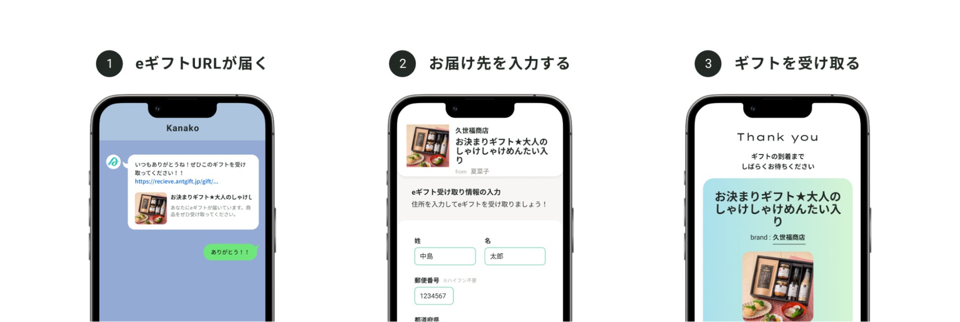 受け取り側は、eギフトURLから住所を入力するだけで、久世福商店の商品を受け取ることができます。