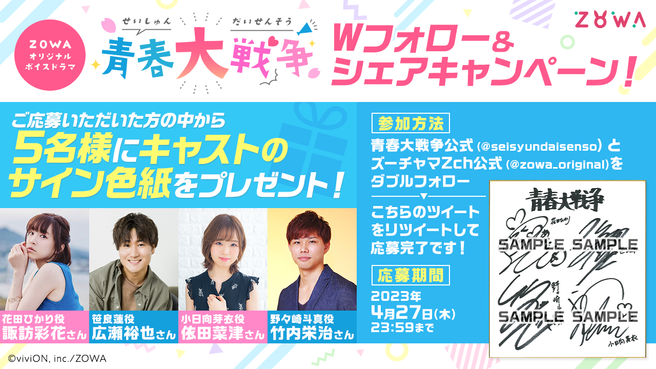 音声・動画の配信サービス『ZOWA』(株式会社viviON、所在地:東京都千代田区、代表取締役:明石耕作)は、諏訪彩花、広瀬裕也、依田菜津、竹内栄治が出演する、恋と友情を描いたボイスドラマ「青春大戦争」を3月30日(木)に配信いたします。主題歌は少年Tがこの番組の為に書き下ろした同タイトルの楽曲「青春大戦争」。卒業、入学シーズンの春にぴったりの元気でさわやかな楽曲に仕上がっています。是非、ボイスドラマと音楽のコラボをお楽しみ下さい。