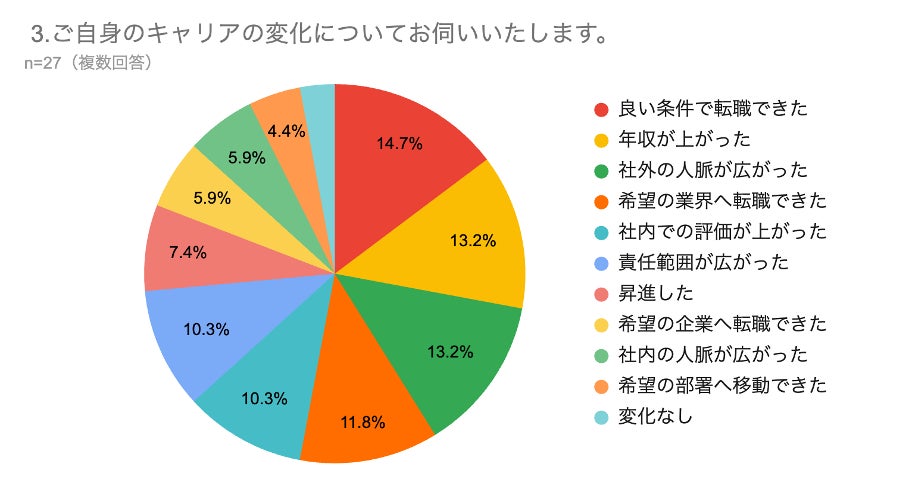 UMass受講後、97%の卒業生が何らかのキャリア変化を経験しています。特に「良い条件で転職できた」(14.7%)、「年収が上がった」(13.2%)、「社外の人脈が広がった」(13.2%)と回答が多かったです。転職市場での競争力向上や社内評価の向上が見られ、スキル向上やネットワーク形成が成功要因と考えられます。大多数がキャリアアップを実現しており、UMass受講が多面的なキャリア成長に寄与していることが明らかになりました。