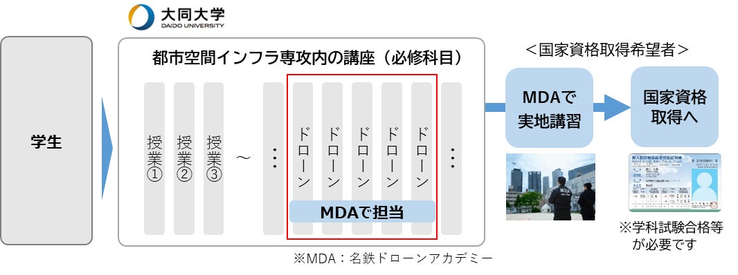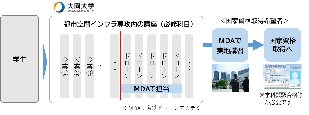 名鉄ドローンアカデミー講師が非常勤講師として必修講座内で講義を実施。国家資格希望者は、加えて名鉄ドローンアカデミーにて別途実地講習を受けることで国家資格取得を目指すことができる。