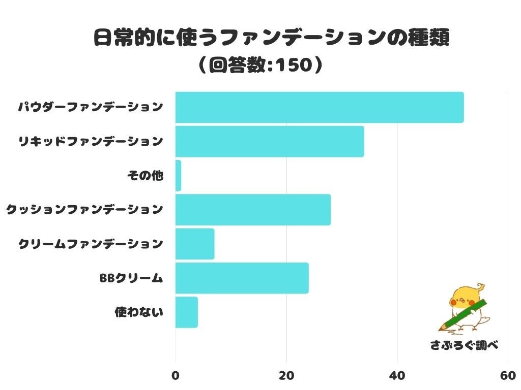株式会社レビュー(https://jafmate.co.jp/)が運営する暮らしに役立つ情報メディア「メイクアップ」( https://sublogg.com/makeup/ )は、日本全国の10歳以上の方を対象に「日常的に使うファンデーションの種類」についてのアンケート調査を実施しました。