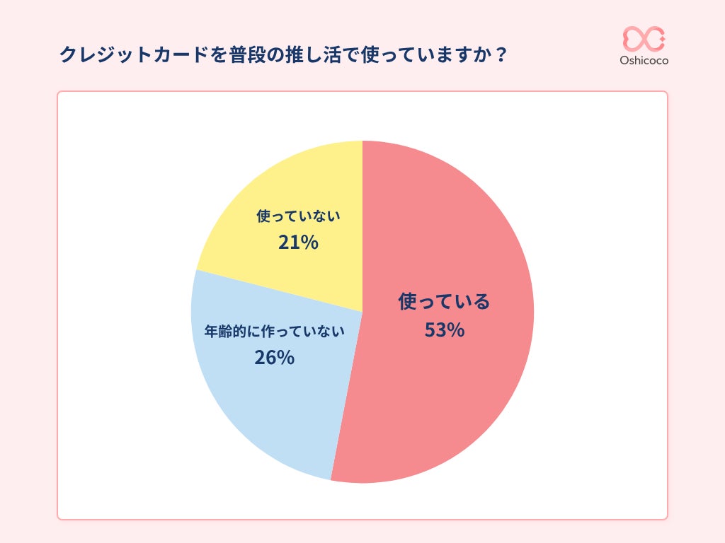 クレジットカードを普段の推し活で使っていると答えた割合は全体の半数以上となり、チケットの決済やグッズの購入などにカードを使用しているという声が聞かれました。一方で「年齢的に作っていない」「使っていない」と答えた推し活層も半数見られました。