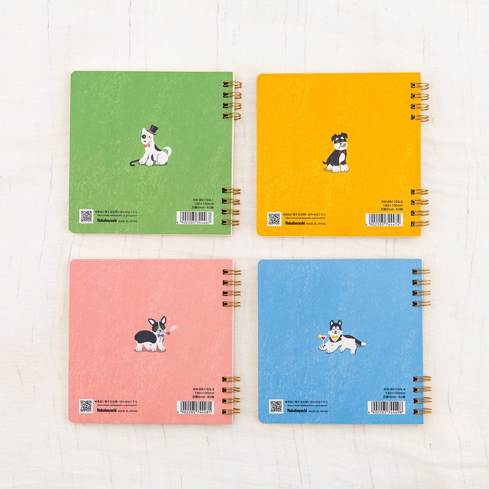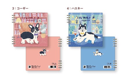 「スイング・ロジカルWリングノートGentleDogs」は、ナカバヤシオリジナルイラスト『GentleDogs』シリーズを採用したWリングノートです。『GentleDogs』シリーズは、「ロジカルノート=論理的」なイメージから、恋多き紳士な犬たちの1日をコンセプトに、ブルテリア、ミニチュアシュナウザー、コーギー、ハスキーの4犬種を描いています。