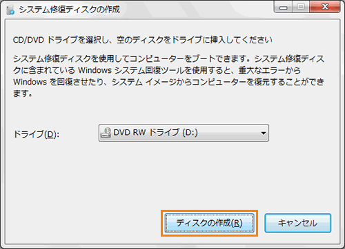 Step4:システム修復ディスクとして利用する、書き込み可能なCD/DVDをドライブにセットして「ディスクの作成(R)」を選択します。