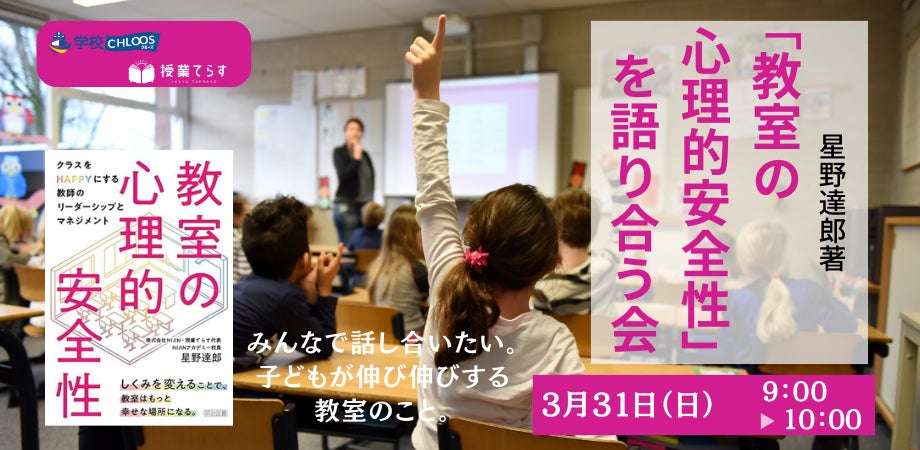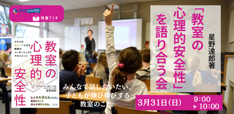 授業てらす、NIJINアカデミー、学校CHLOOSなど、数多くの教育事業を手掛ける星野達郎氏の初の著書「教室の心理的安全性」に書かれてある具体的事例を話題にしながら、子どもたちが生き生きとする教室の作り方について語り合います。