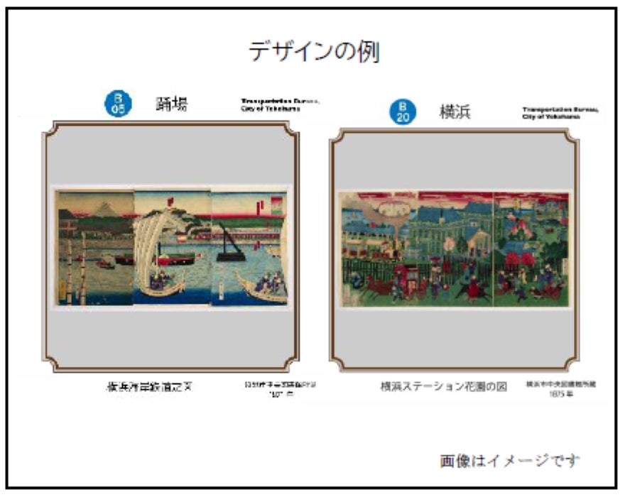 スタンプのデザインは、横浜の鉄道の歴史を知っていただけるよう横浜市中央図書館所蔵の浮世絵を活用しました。横浜の歴史とともに街並みをお楽しみください。