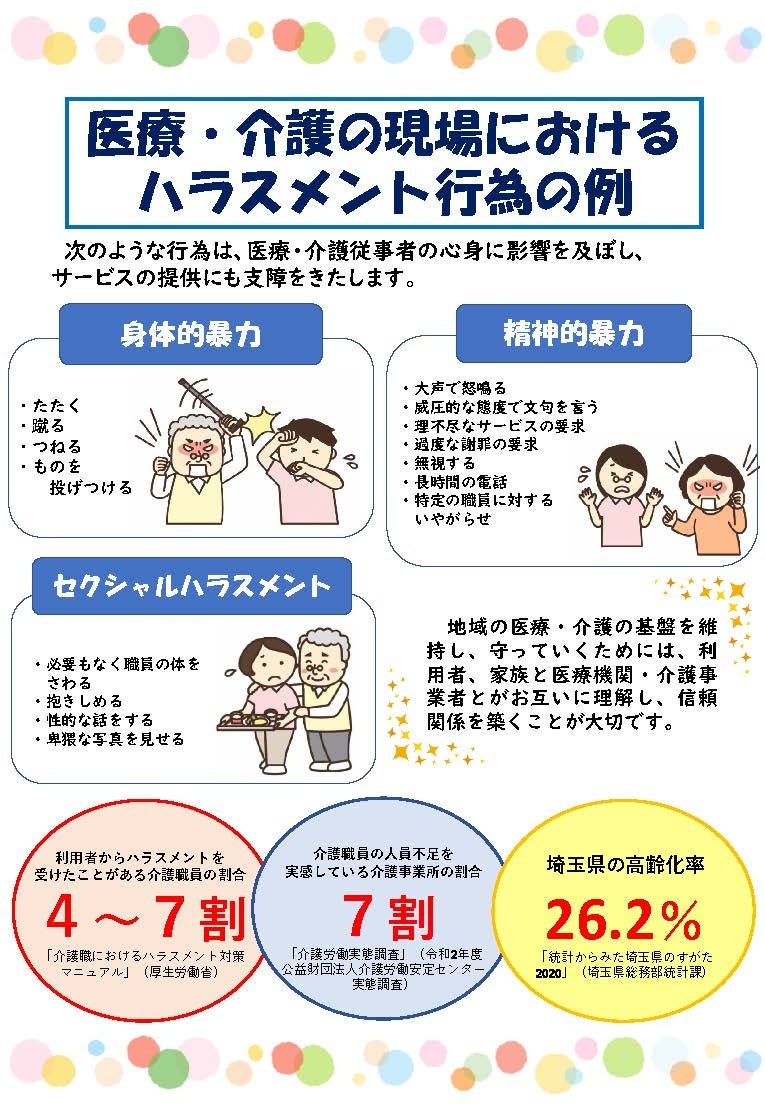 高齢化が進み、医療・介護など人のケアに関わる人材が不足する可能性がありますが、医療・介護従事者へのハラスメントを防止することは、医療・介護従事者が安心して働くことができる環境をつくり、離職を防ぎます。従事者と利用者や家族がお互いを理解し信頼関係を築くことで、利用者はより良いサービスを継続して利用していただけることにつながります。