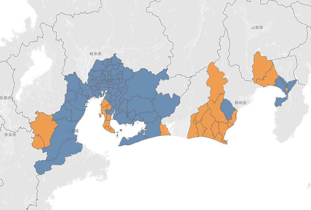 三重県:津市、松阪市、亀山市、鈴鹿市、四日市市、菰野町、朝日町、川越町、桑名市、いなべ市、木曽岬町、東員町