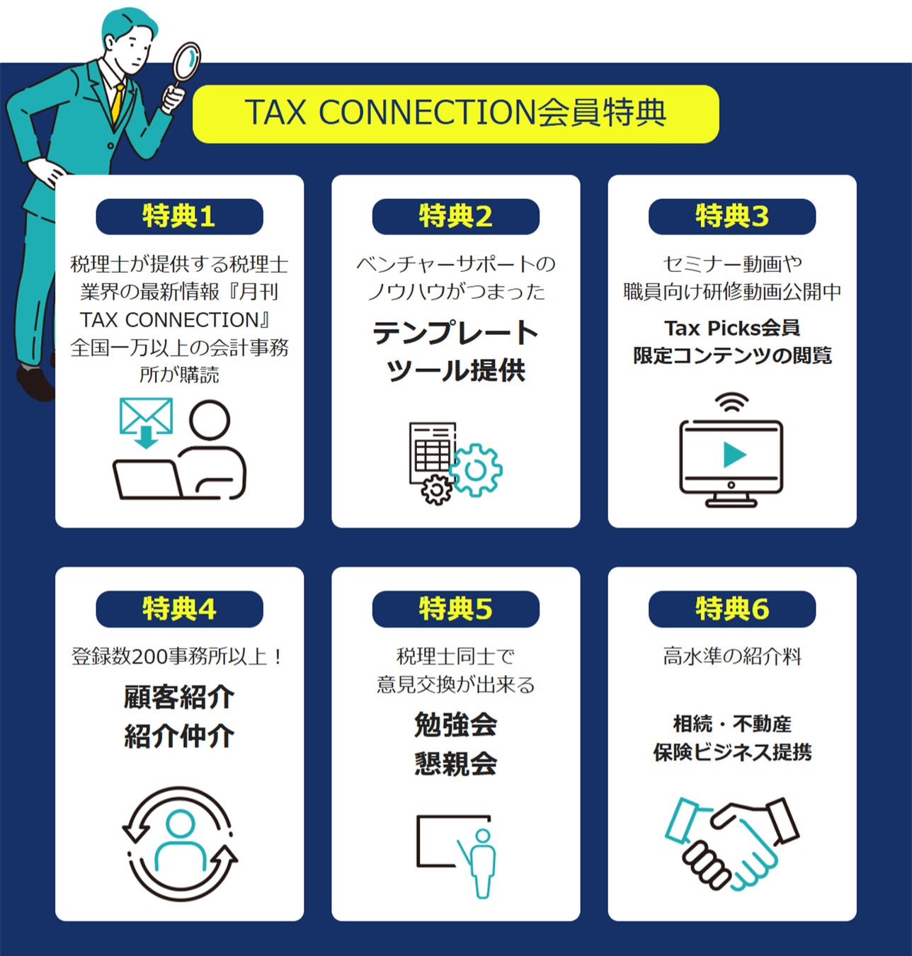 税理士事務所の経営に役立つ情報として、税理士業界トップクラスの3万社超の起業家支援を通して培った経験や経営ノウハウをメールマガジンやセミナー動画、勉強会を通じて提供しています。また、顧客紹介や相続・不動産などの各種提携サービスもTAX CONNECTION会員の税理士に提供しています。