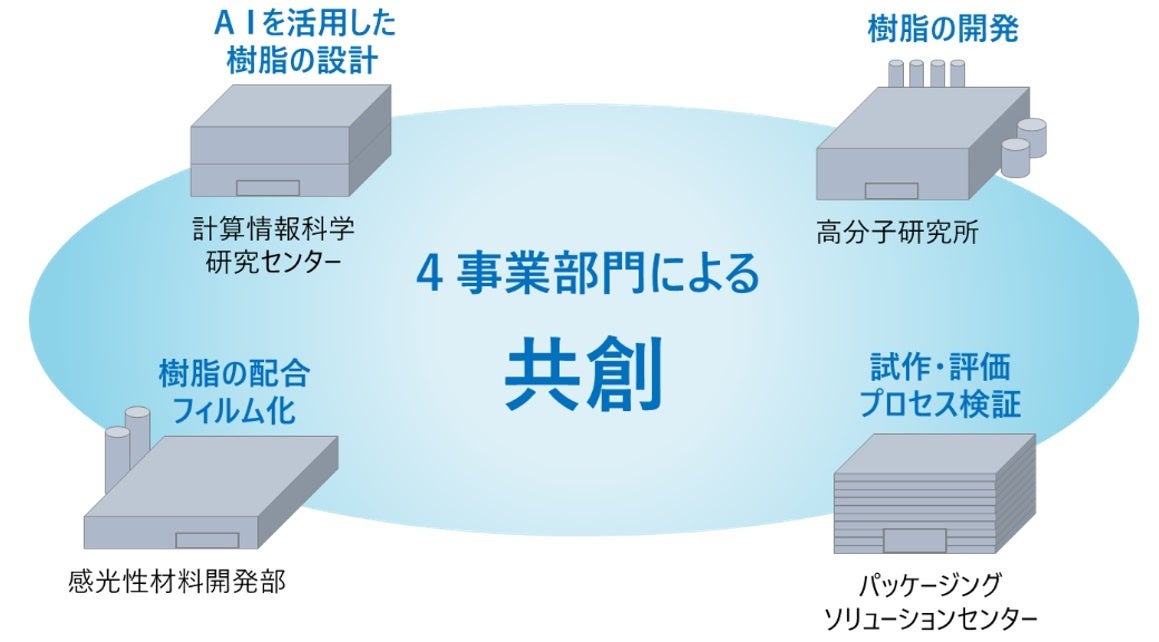 開発においては4つの事業部門による共創が行なわれました。今回、要求される高解像度を達成するための鍵となる新たなポリマー樹脂を開発しました。この開発では計算情報科学研究センターのAI技術を活用して最適な樹脂設計を行い、高分子研究所が実際の樹脂開発を担当しました。さらに、この樹脂を使用して感光性材料開発部が配合とフィルム化を実施しました。最終的に、パッケージングソリューションセンター※3が実際にこのフィルムを用いてパネル上に銅配線を試作・評価し、最適なプロセスの検証まで行っています。
