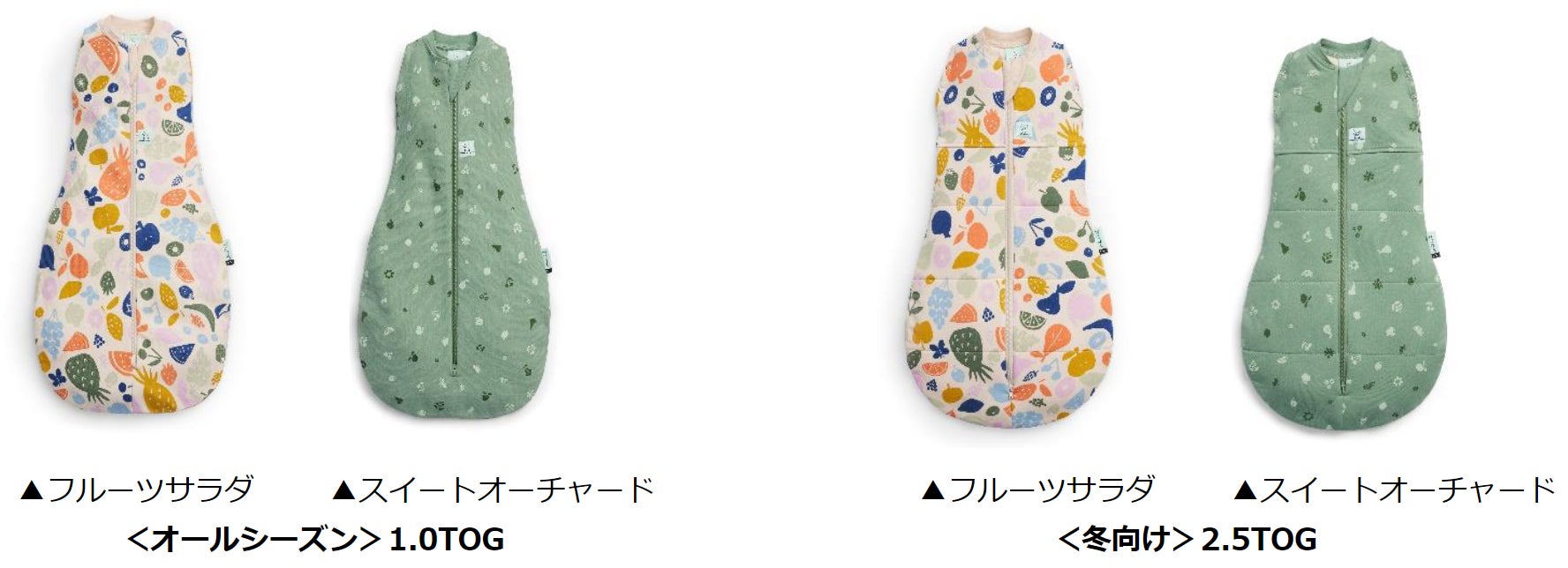数量限定のシーズンカラーは、レモン、ライム、オレンジ、パイナップル、チェリーなど、カラフルなフルーツをあしらった「フルーツサラダ」のデザインと、アースカラーのグリーンをベースにジューシーなフルーツをデザインした「スイートオーチャード」の2種類です。どちらもお子様の睡眠時間を明るく彩るデザインで、男女問わず使いやすく、出産祝いなどのギフトにもおすすめです。