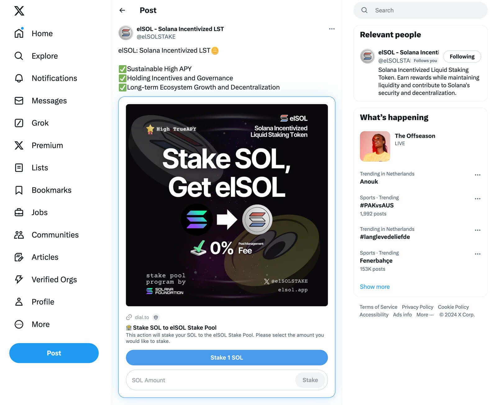 Solana Incentivized LST の elSOL が新技術 Blinks によるステーキングに対応