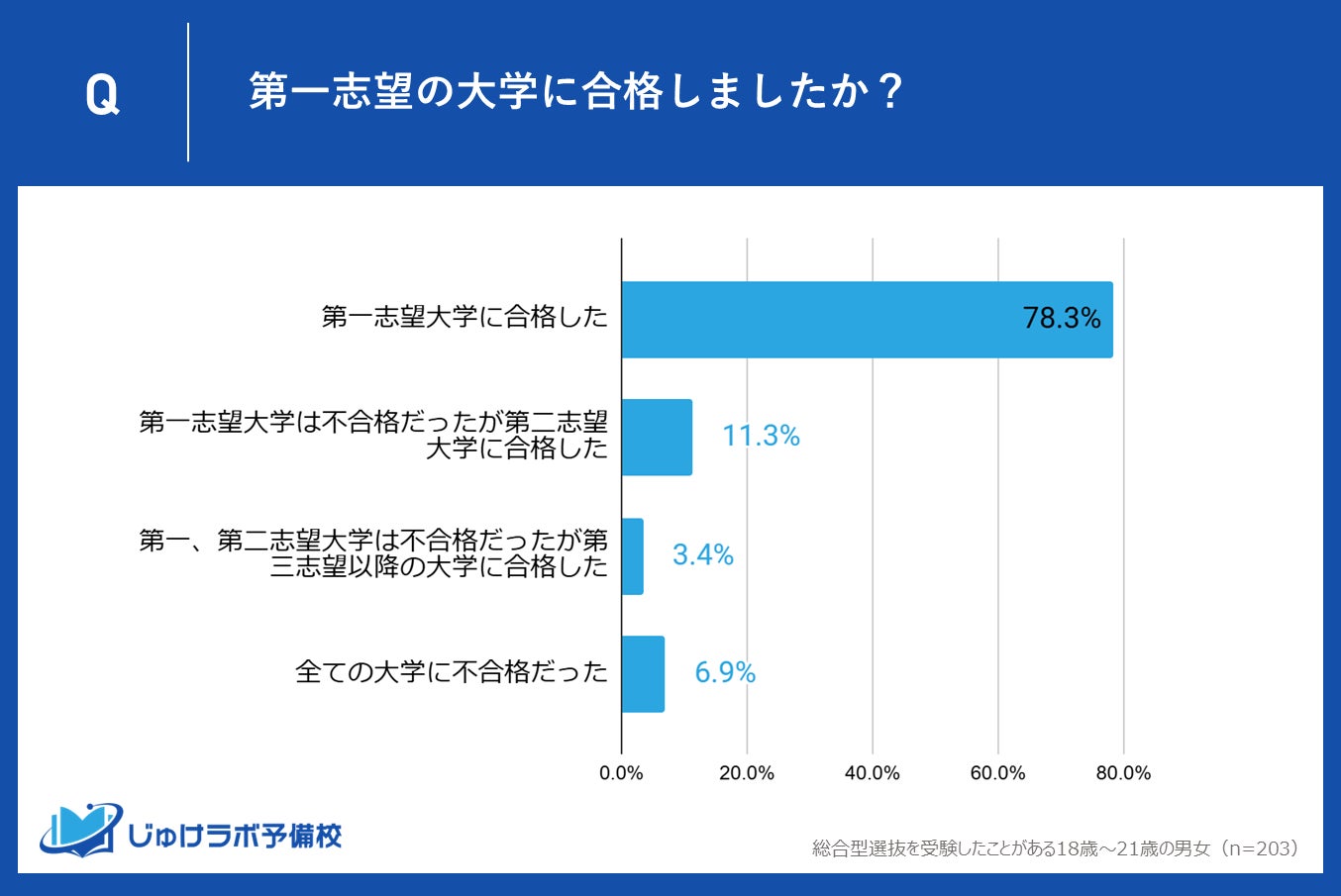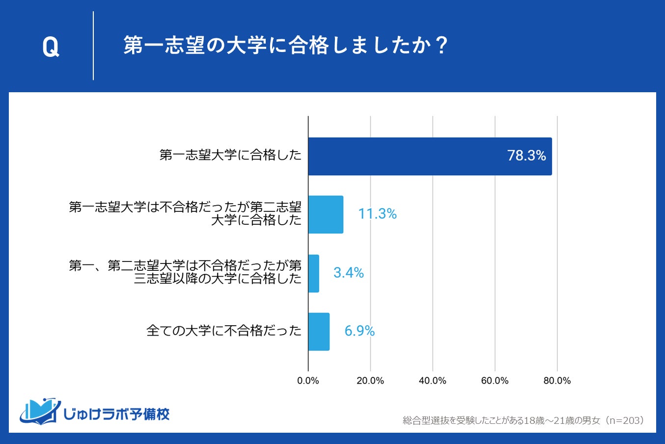 調査結果によると、総合型選抜入試で受験した学生の78.3%が第一志望の大学に合格していることがわかりました。この結果は、一般入試に比べて「志望校合格の可能性が高い」ことを示唆していると言えるでしょう。