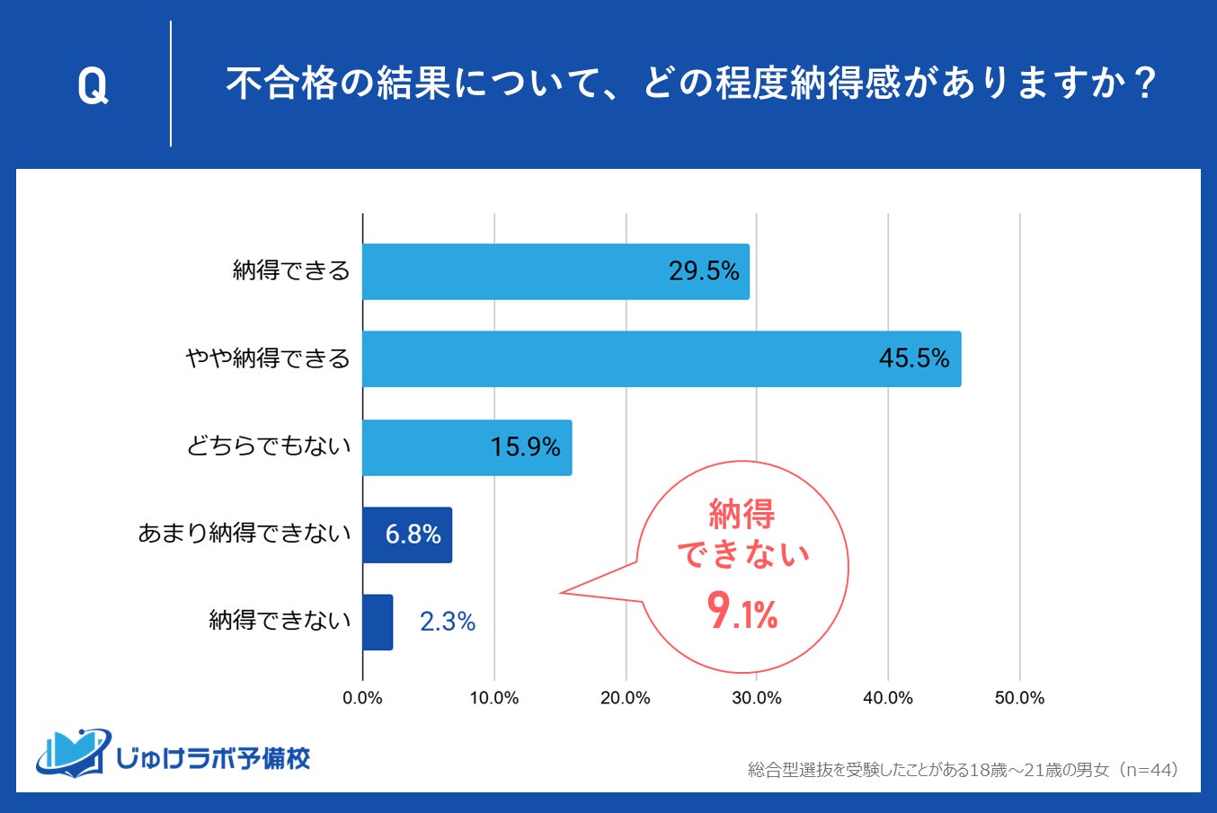 一方で、「納得できない」(2.3%)および「あまり納得できない」(6.8%)と回答した受験生はわずか9.1%にとどまりました。一般的に、大学受験では不合格者の多くが「不満」や「悔しさ」を抱えることが多いとされていますが、総合型選抜入試ではこの割合が低く、「納得感」が比較的高いことがうかがえます。