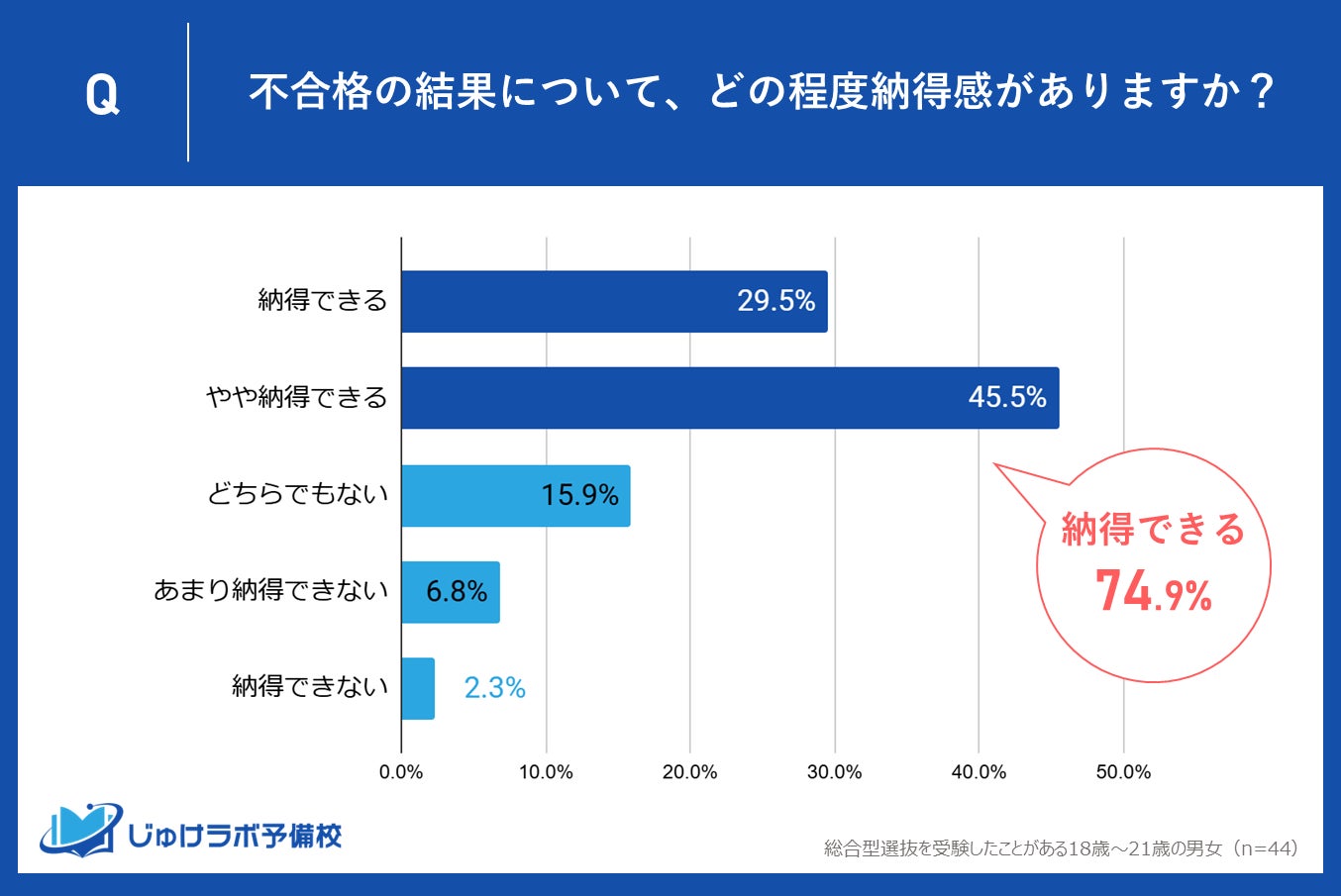 今回、「総合型選抜入試で第一志望大学に合格しなかった」18~21歳の男女44人(第二志望合格者、第三志望合格者、全て不合格者)を対象に調査を実施した結果、第一志望大学に落ちた結果に対して「納得できる」「やや納得できる」と回答した人が合計74.9%にのぼることが判明しました。