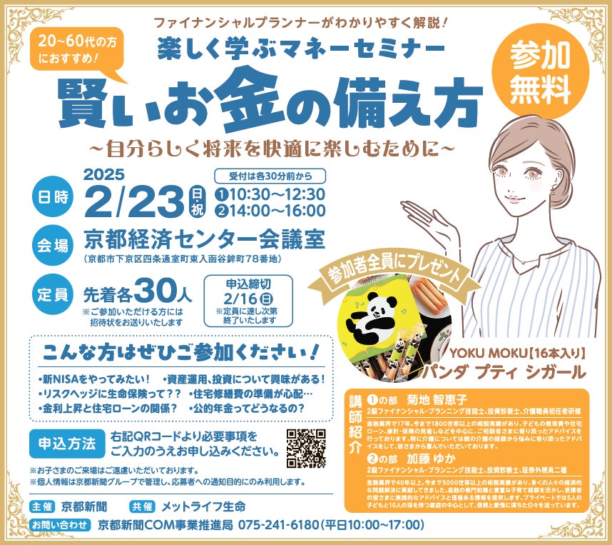 【京都新聞主催】2月23日にマネーセミナーを開催!ファイナンシャルプランナーがお金の備え方をわかりやすく解説します