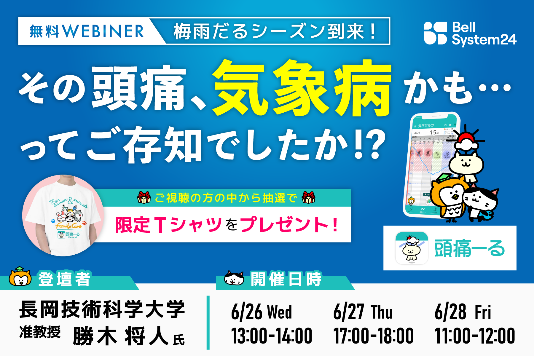 株式会社ベルシステム24(本社:東京都港区、代表取締役 社長執行役員:梶原 浩、以下:当社)は、梅雨の時期に起こりやすい気象病をテーマに、「イノベーターズラウンジ~梅雨だるシーズン到来!その頭痛、気象病かも…ってご存知でしたか!?」を6月26日(水)~28日(金)に限定配信します。