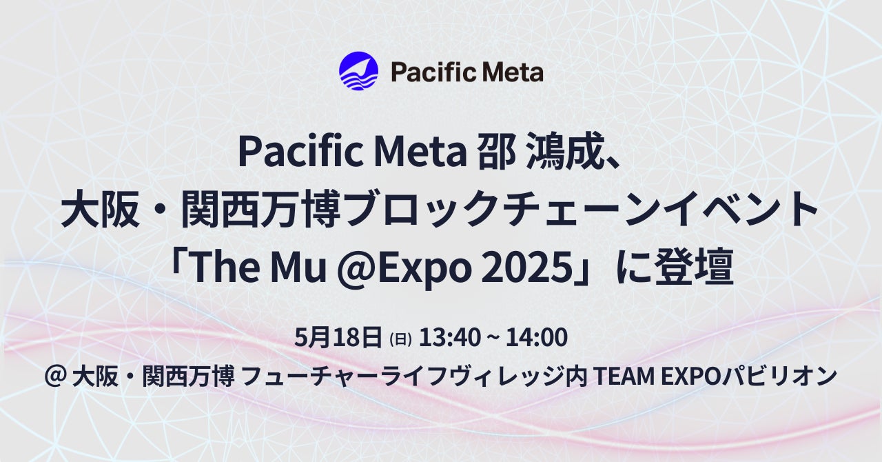 Web3領域でアクセラレーター事業を展開する株式会社Pacific Meta(本社:東京都港区、代表取締役:岩崎翔太、以下「当社」)の執行役員邵鴻成が、大阪・関西万博期間中に開催されるブロックチェーンイベント「The Mu @Expo 2025: Global Ethereum Movement」に登壇することをお知らせいたします。世界の英知が集う大阪・関西万博において、日本のグローバル化におけるWeb3の可能性について議論します。