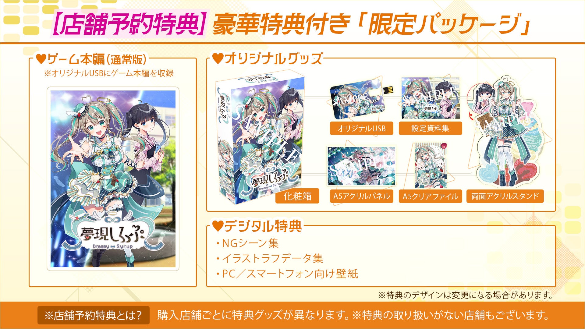 このパッケージは、ゲーム本編に加えオリジナルグッズとデジタル特典などの豪華特典が各種同梱されています。さらに一部の店舗では予約特典がついてきます。どのような店舗特典がついているかは、各店舗または『夢現しろっぷ - Dreamy Syrup -』公式サイトにてお知らせします。