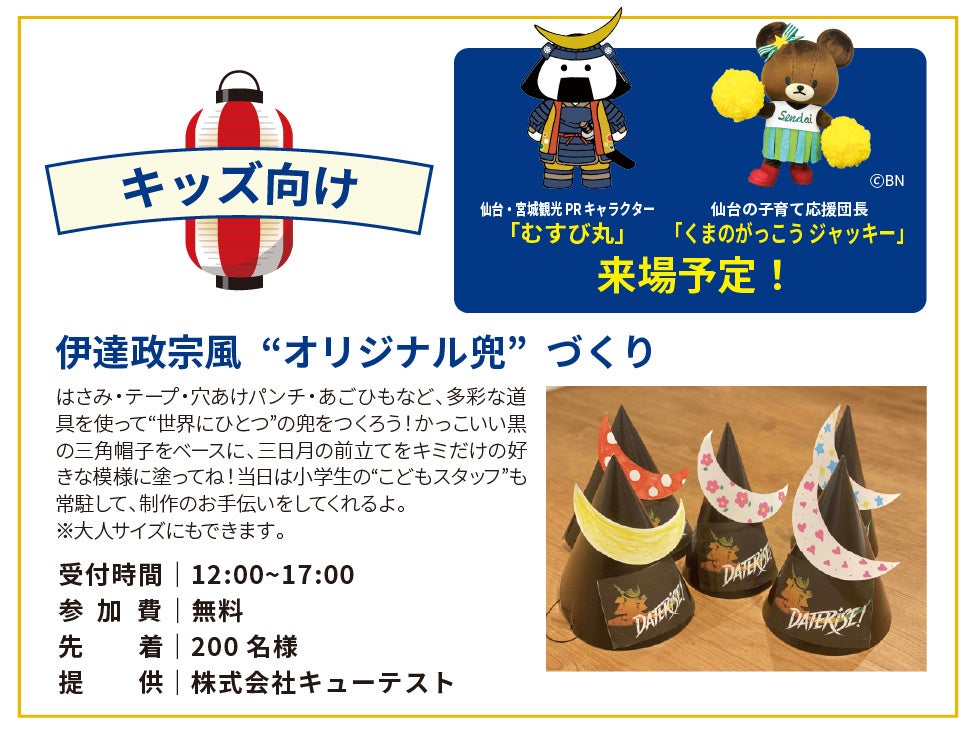 また、縁日ENNICHI関連企画として、DATERISE!(ダテライズ)にちなんで伊達政宗風 “オリジナル兜” づくり(先着200名様、株式会社キューテストご提供)もお楽しみいただけます。