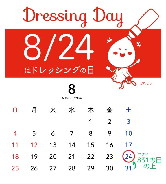 また、カレンダーで見ると「野菜の日(8月31日)」の上にあるのが8月24日であることから、野菜にドレッシングをかける様子をイメージし「ドレッシングの日」と制定しました。