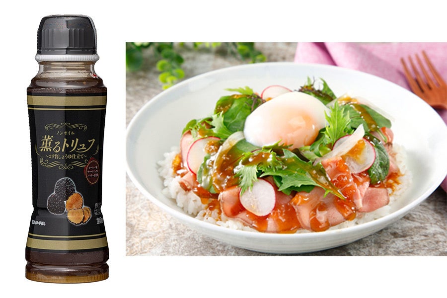 ヨーロッパ産トリュフのパウダーを使用した芳醇な香りのノンオイルドレッシングです。馴染みのあるしょうゆベースにたまねぎの甘味と旨味を加えました。程よい酸味で料理のソースとしても活躍します。
