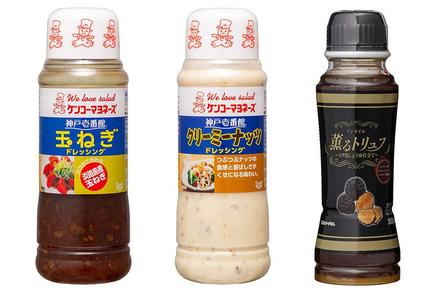 毎日使える味わいで発売以来長年愛されている「神戸壱番館®」シリーズから、『玉ねぎドレッシング』と『クリーミーナッツドレッシング』、そして、芳醇なトリュフの香りと贅沢な味わいが楽しめる『ノンオイル 薫るトリュフ~コク旨しょうゆ仕立て~』の3本をセットにして、抽選で100名様にプレゼントします。