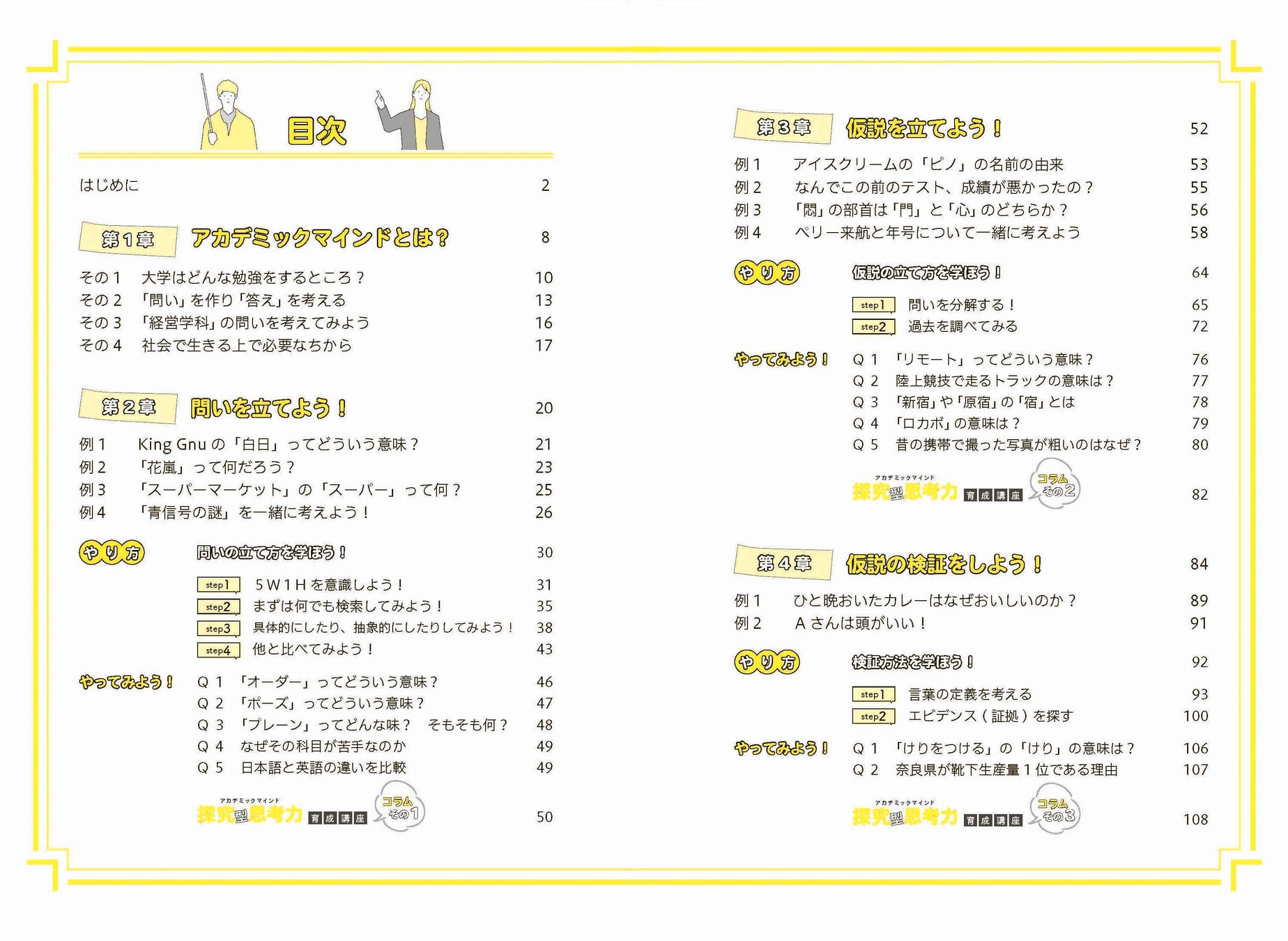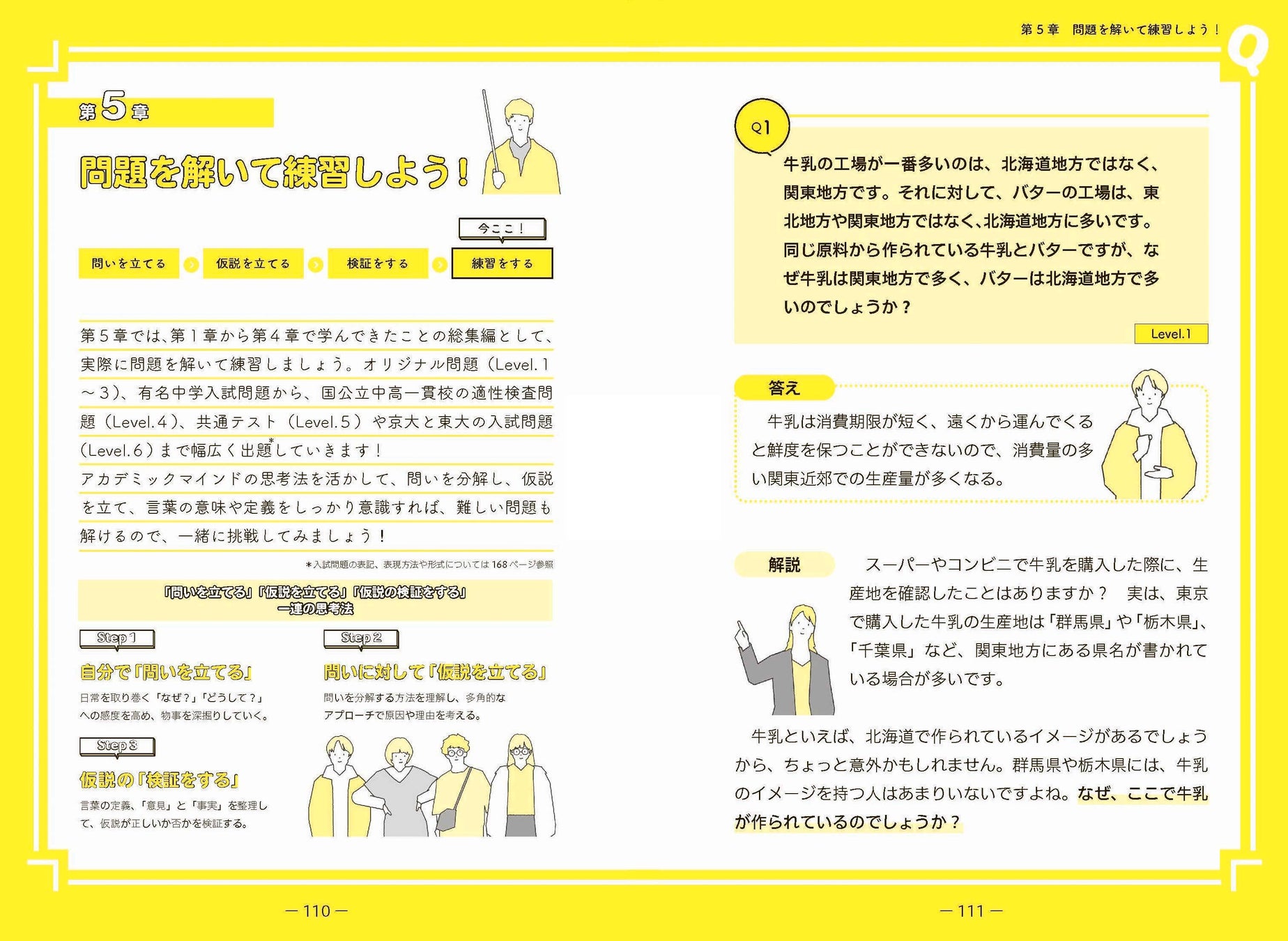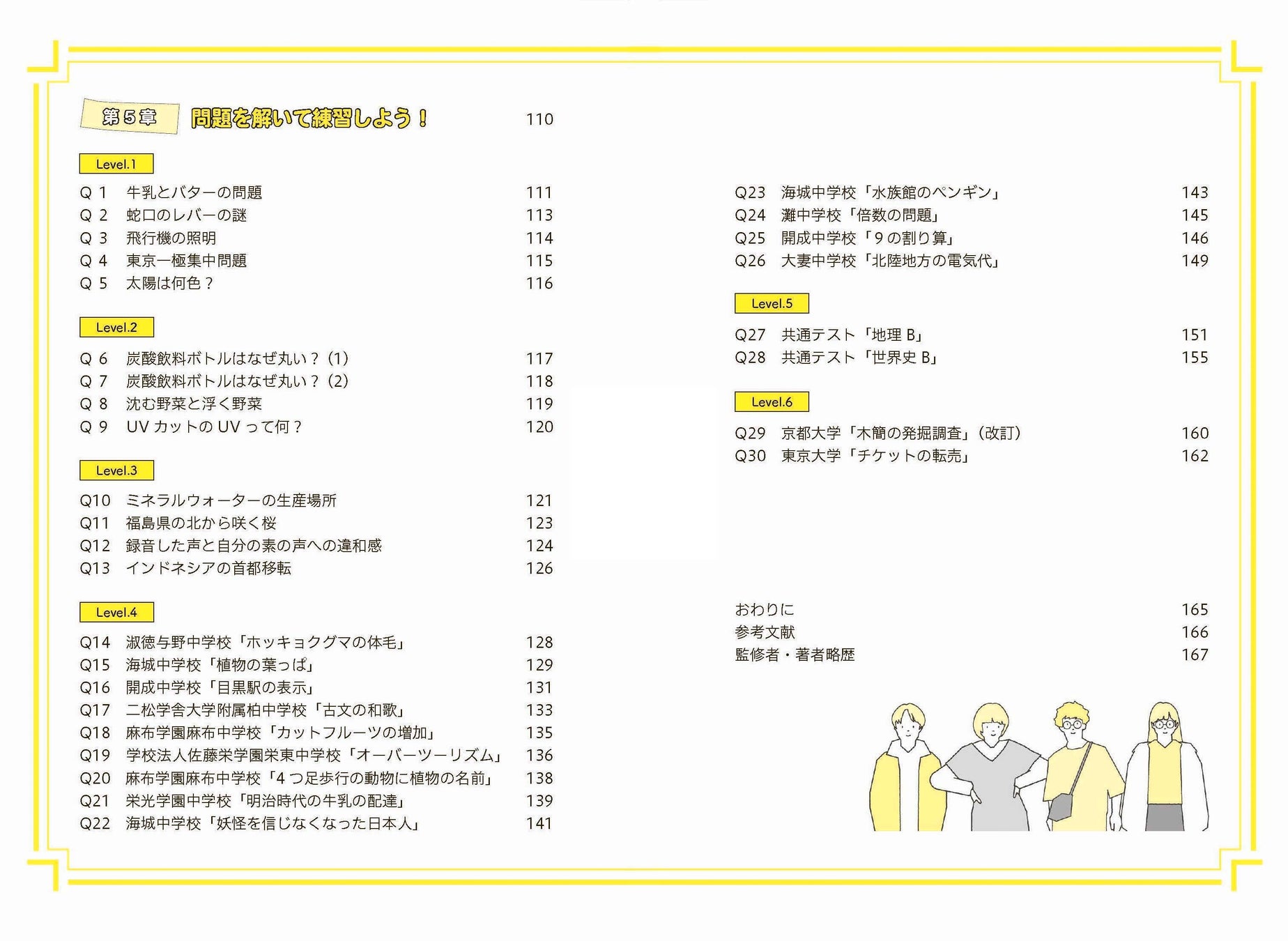 第1章ではこの思考スタイルが何か、わかりやすく説明しています。第2章から4章では、出張授業の内容をベースに丁寧に順序立てて具体例やイラスト、図を交えながら解説し、練習問題を出題。「思考力・判断力・表現力」を問う探究型問題を解く力が身につきます。また、様々な問題に直面した時に自分で解決できる力も身につけることで、考え方、視野、進路の選択肢が広がるという可能性を提示します。