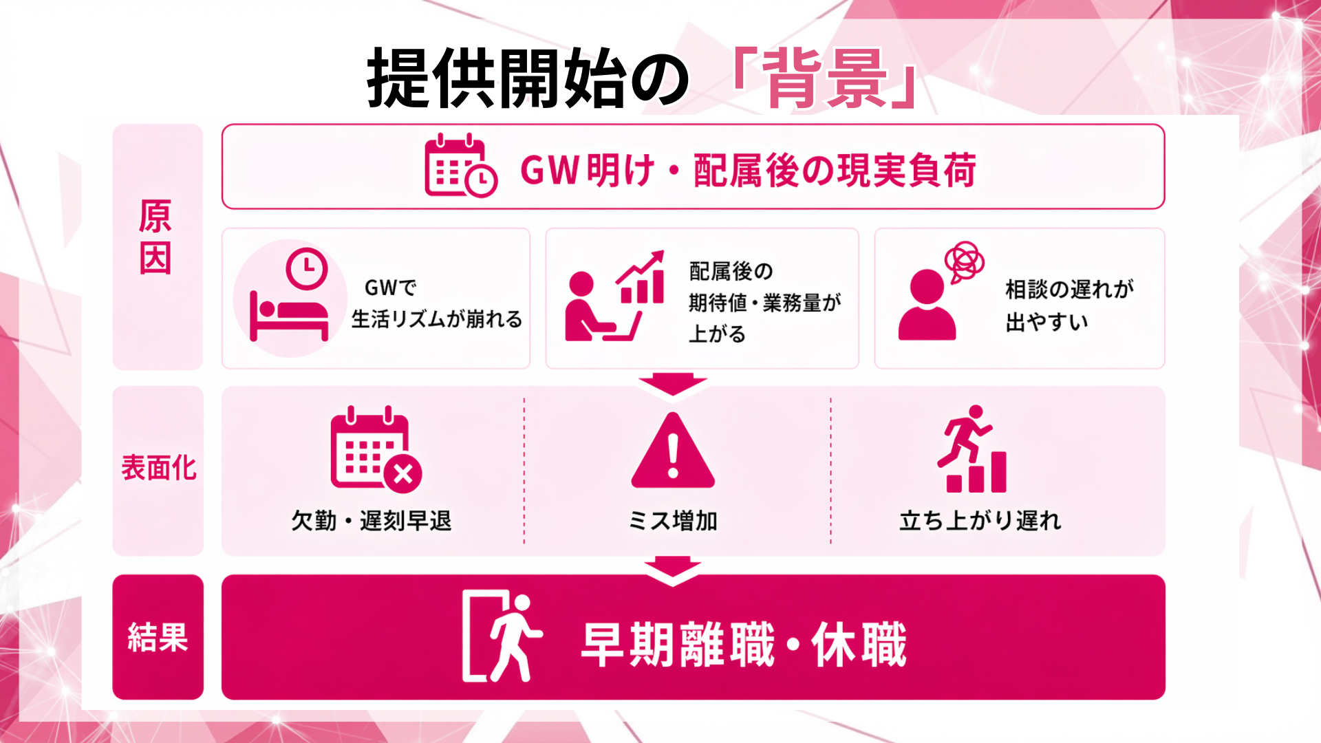 研修相談(現状課題:GW明け不調、欠勤傾向、オンボ遅延、早期離職リスクの整理)