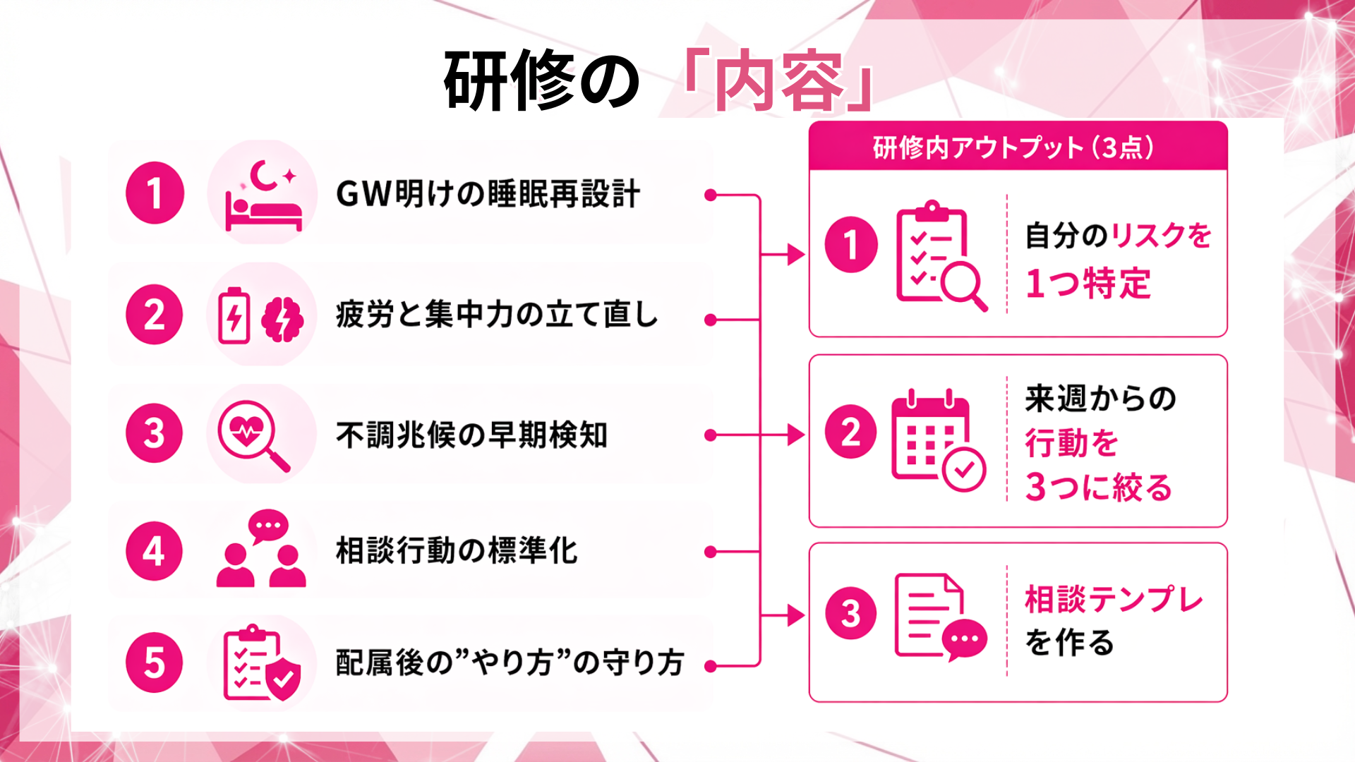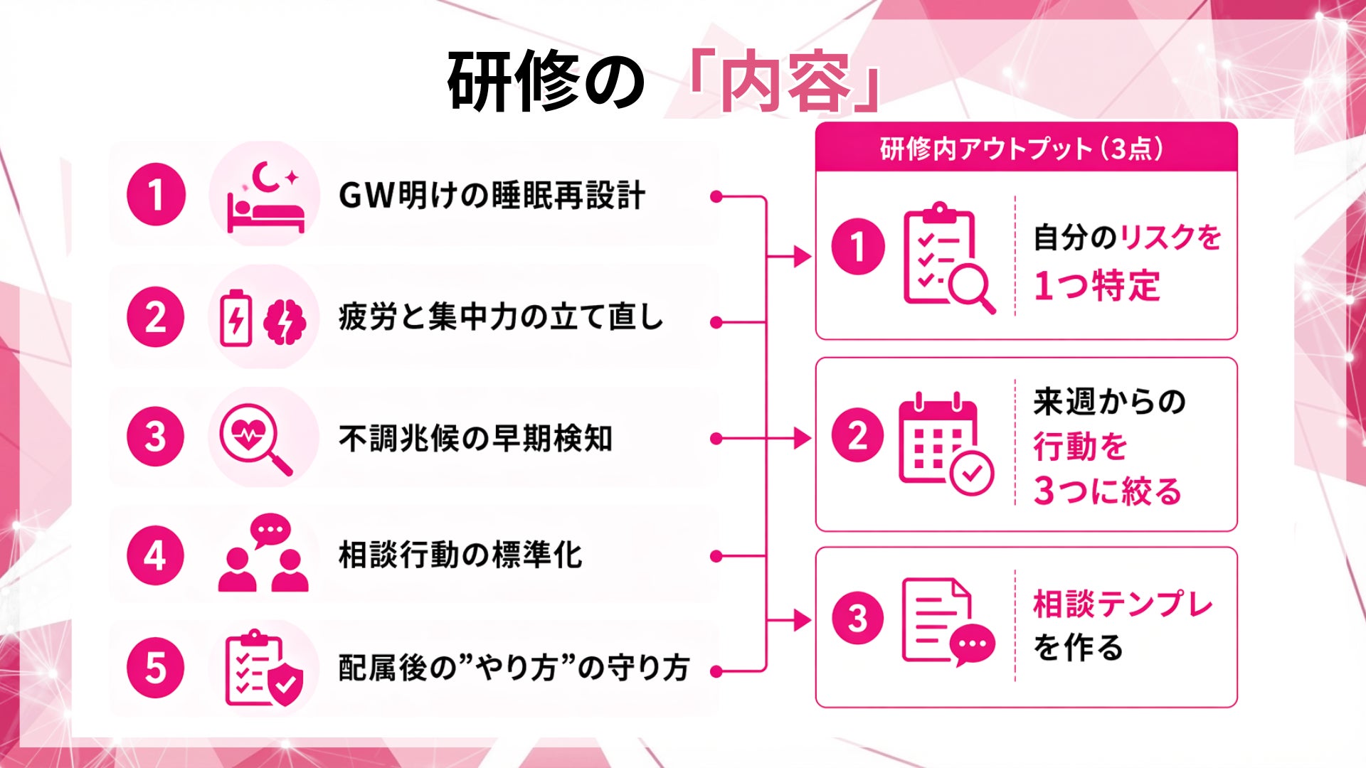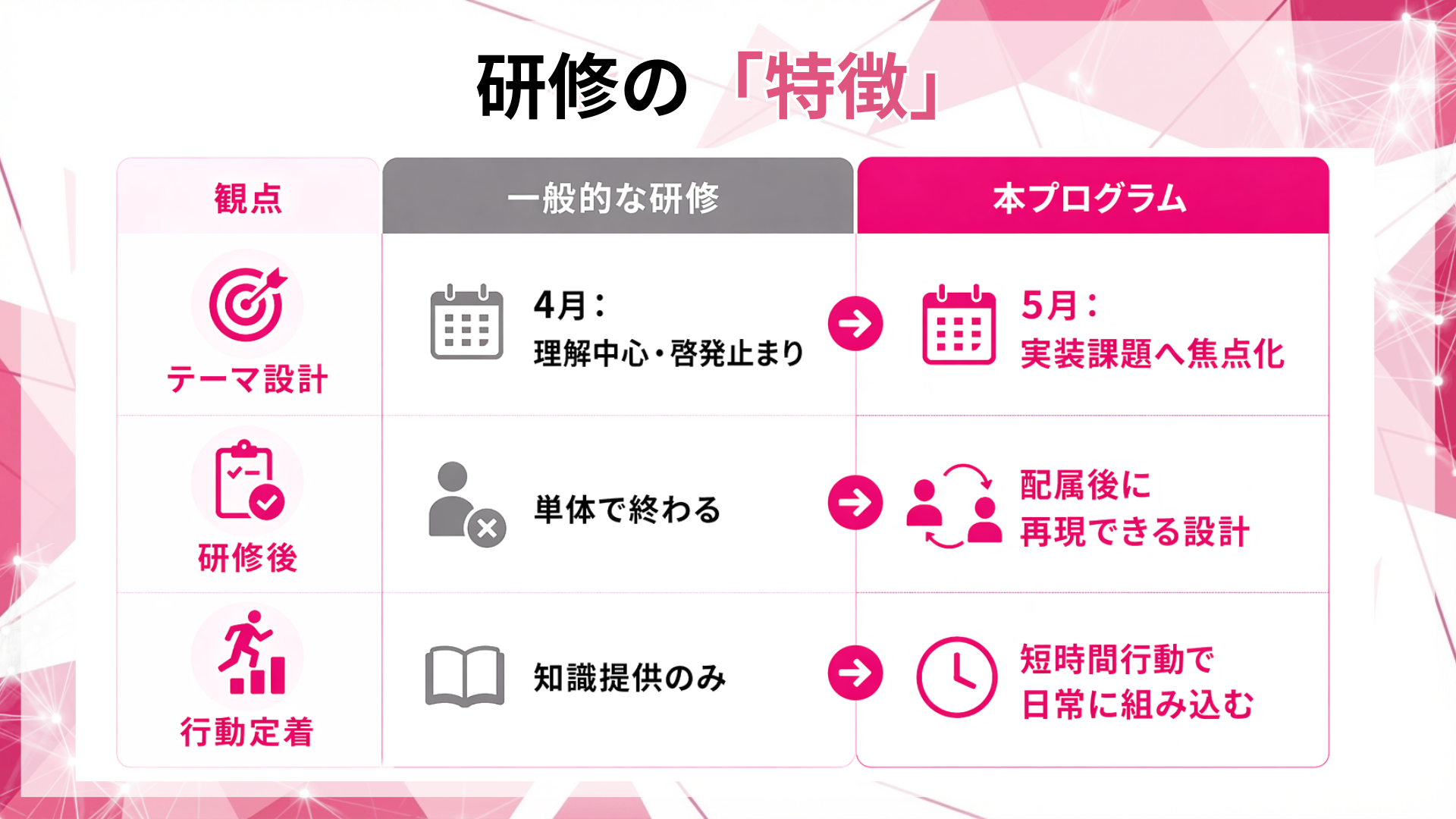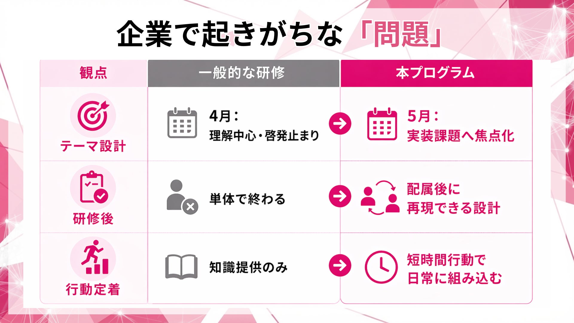 当社は、5月に効く論点へ研修テーマを再編集し、配属後の実務に落ちる設計で提供します。