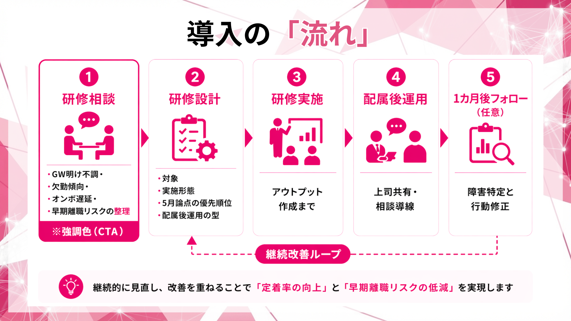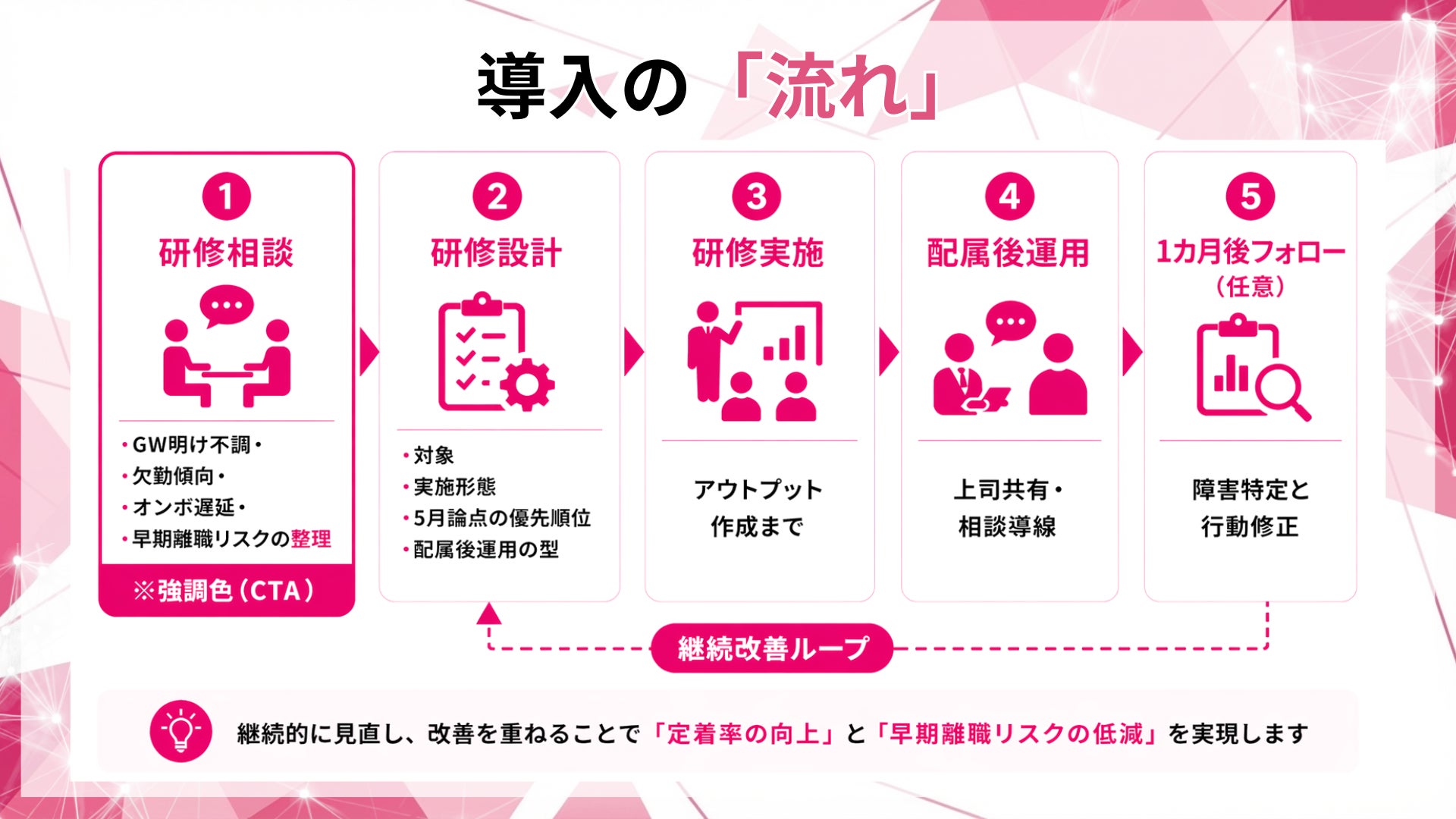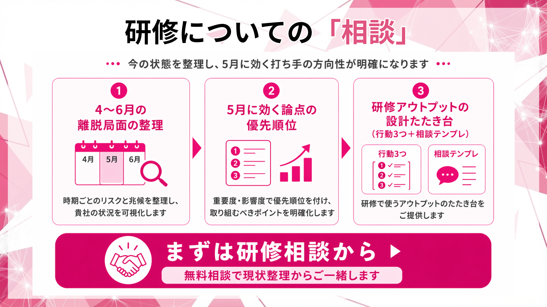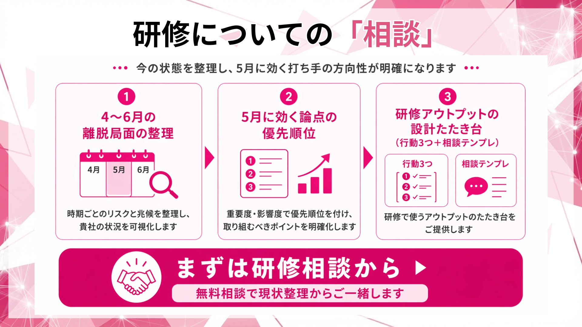 研修相談では、貴社の4〜6月の離脱局面を整理し、5月に効く論点の優先順位と、研修アウトプット(行動3つ+相談テンプレ)の設計たたき台をご提示します。
