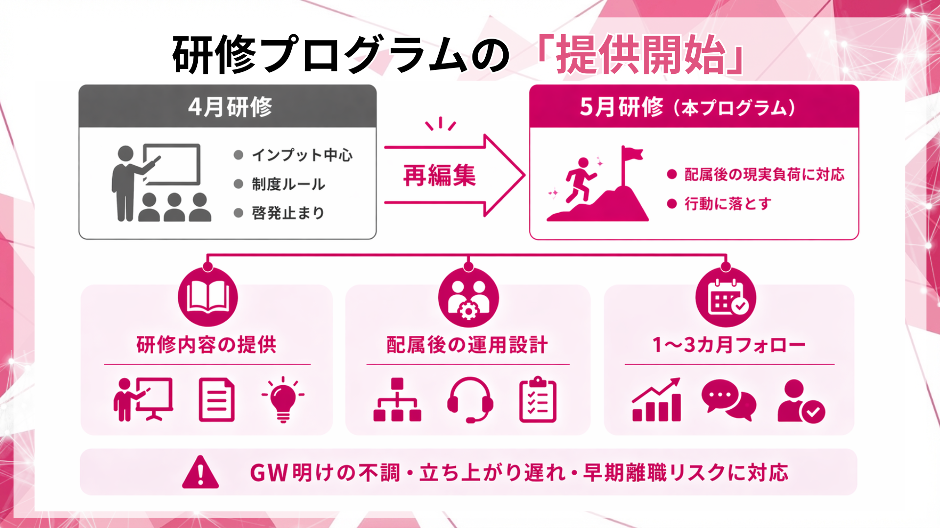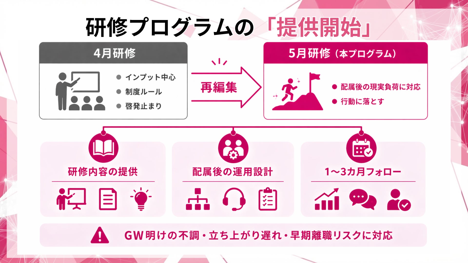 本研修は、研修単体で終わらせず、配属後の運用(相談導線、上司の受け止め、1〜3カ月フォロー)まで含めて設計します。