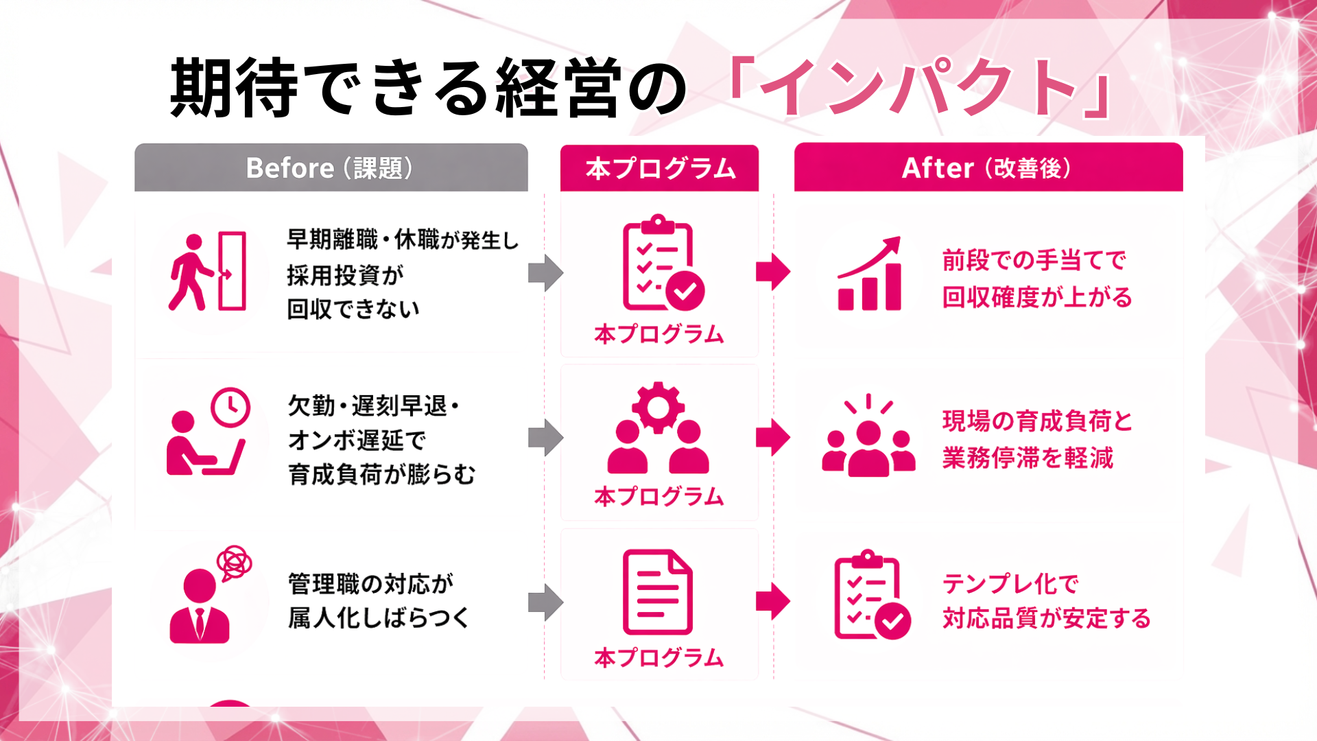 結果として、欠勤・遅刻早退・オンボ遅延・初期評価のばらつきが増え、育成工数が膨らむ