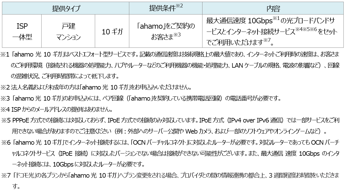 本プランは、ahamoとセットでご利用いただくことで、インターネット接続サービスと最大10Gbps(※1)の高速通信を使い放題でご利用いただけるISP一体型の光回線プランです。