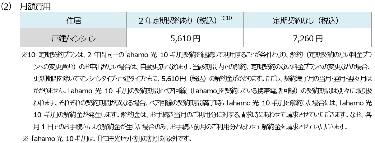 ※3 定期契約プランは、2年間同一の「ahamo光 10ギガ」契約を継続して利用することが条件となり、解約(定期契約のない料金プランへの変更含む)のお申出がない場合は、自動更新となります。当該期間内での解約、定期契約のない料金プランへの変更などの場合、更新期間を除いてマンションタイプ・戸建タイプともに5,610円(税込)の解約金がかかります。ただし、契約満了月の当月・翌月・翌々月はかかりません。「ahamo光 10ギガ」の契約期間とペア回線(「ahamo」を契約している携帯電話回線)の契約期間は別々に取り扱われます。それぞれの契約期間が異なる場合、ペア回線の契約期間満了時に「ahamo光 10ギガ」を解約した場合には、「ahamo光 10ギガ」の解約金が発生します。解約金は、お手続き当月のご利用分に対する請求時にあわせて請求させていただきます。なお、各月1日でのお手続きにより解約金が生じた場合のみ、お手続き前月のご利用分とあわせて解約金を請求させていただきます。