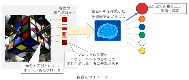 ・独自のAIを用いたアルゴリズムを応用し、ブロックの位置やロボットハンドの影によって同じ色の見え方に差異があっても補正し、パズルキューブの色を正確に識別。特に色味が近く識別が難しい赤色とオレンジ色のブロックの自動認識・識別を実現