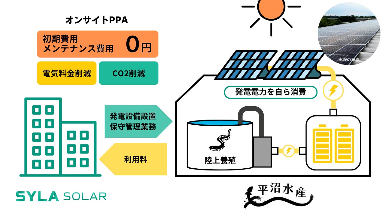 今回、シーラソーラーが開始したオンサイトPPA*事業により、埼玉県児玉郡上里町に位置する平沼水産の鰻陸上養殖場に太陽光発電の電力を供給します。平沼水産は、閉鎖型循環式陸上養殖システムを採用し、鰻の養殖および加工販売を行っており、年間の電気代削減が経営課題となっていました。今回の取り組みにより、従来の電力系統から購入していた電力の一部を、初期費用0円でオンサイトPPAに切り替えることで、電気代を削減する見通しです。
