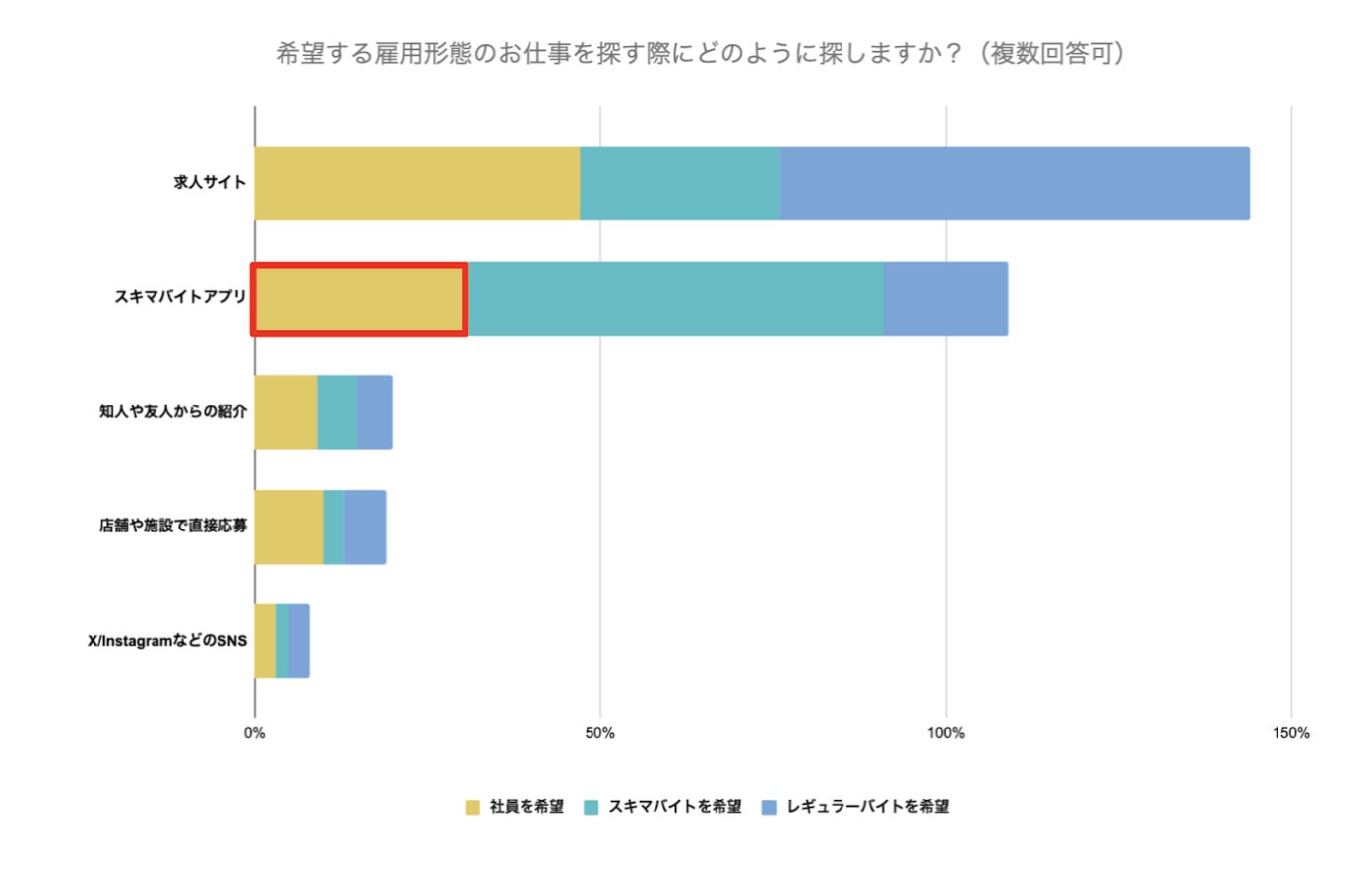 さらに、「雇用形態として社員を希望している人の31%がスキマバイトアプリを利用して探している」という結果は、正社員や長期雇用の仕事を探すための入り口としてスキマバイトアプリを利用している層が一定数存在することが明らかになりました。この傾向から、スキマバイトサービスを利用している企業側も、スキマバイトを通じて正社員登用する人材を発掘し、採用後のミスマッチの軽減などにつなげられる可能性があると考えられます。柔軟なはたらき方や、収入の多角化という特徴から、スキマバイトの活用やアルバイトの掛け持ちが進む一方で、安定した雇用を求める方が一定数いることは、企業の採用戦略において重要な示唆を与えています。面接などの短時間の場ではなくスキマバイトなどの就業体験を通じて行う採用においては、企業側も、なる就業条件だけでなく、仕事の教育体制や職場風土といった就業環境の魅力を示すことが、よりよい人材の確保に繋がっていくと考えられます。