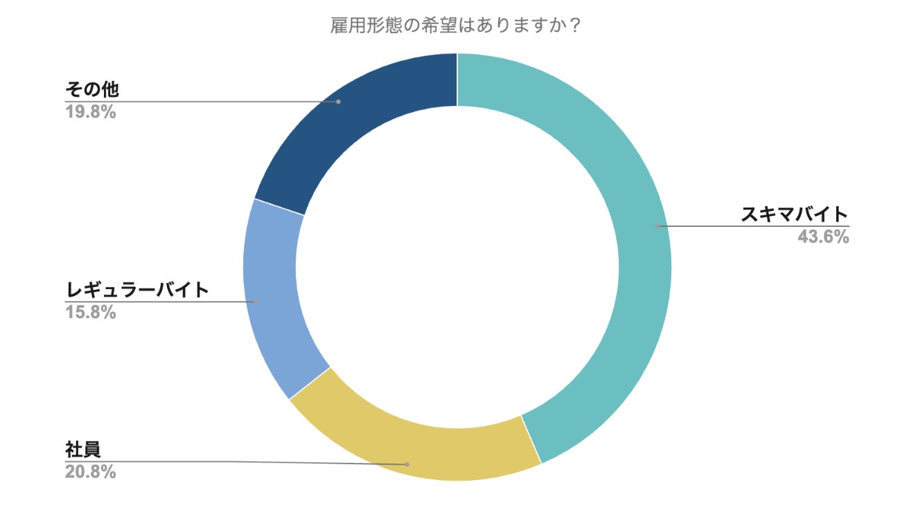 上記の質問で「はい」と回答した方のうち、雇用形態の希望はありますか?という質問に対して、43.6%の方が「スキマバイト」と回答し、長期的な雇用形態である「社員」と回答した方が20.8%、「レギュラーバイト」と回答した方が15.8%だった。