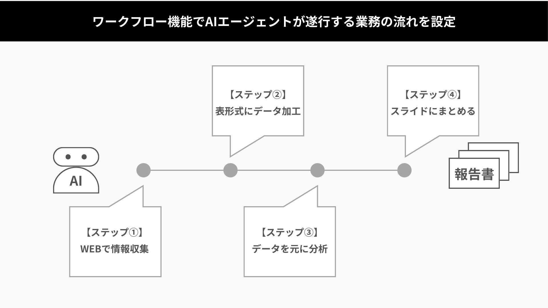 ワークフロー機能は、複数のAIエージェントや業務プロセスを連携させ、一連の作業を自動化する仕組みです。ユーザーが設定した条件や起点に基づいて、文書作成、データ処理、通知送信、外部システム連携などの業務を順次実行します。従来は人が手動で行っていたルーティンを、AIが自動的に処理することで、大幅な効率化と品質向上を実現しています。