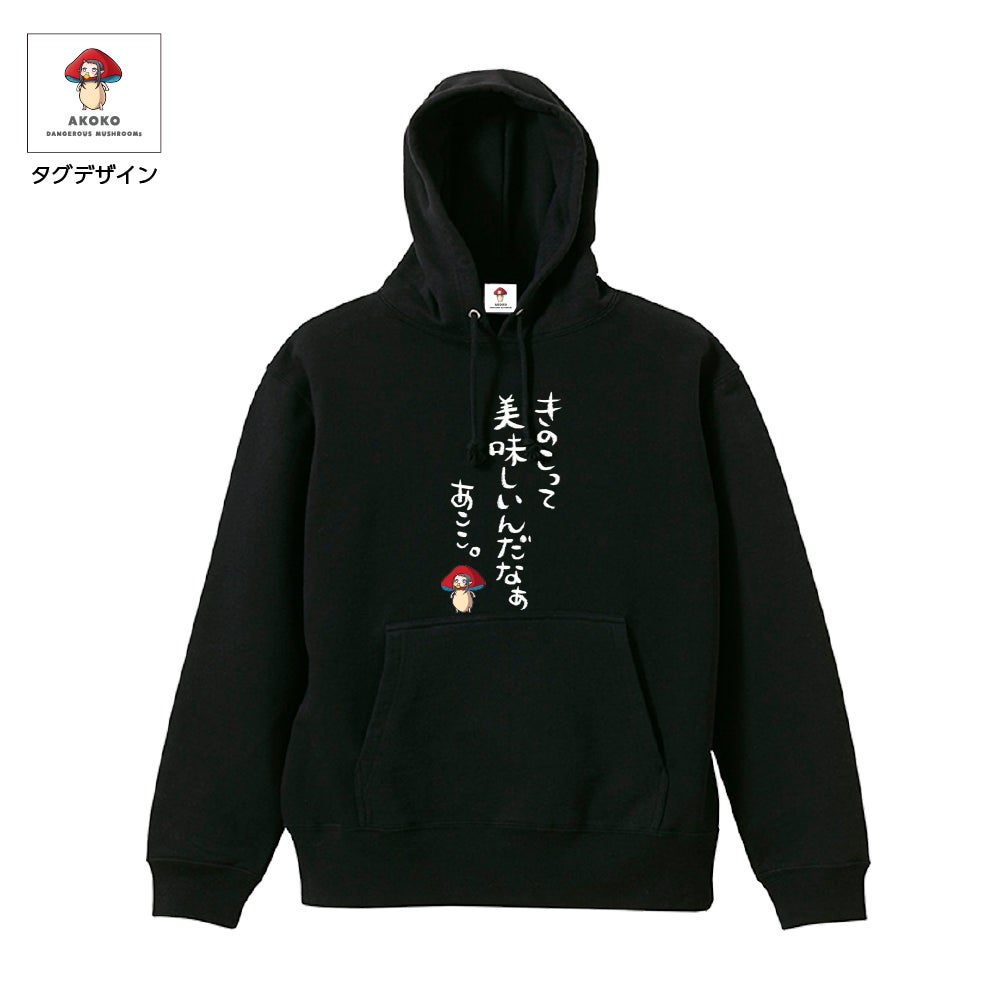 「きのこって美味しいんだなぁ」のあここパーカー(黒)です。