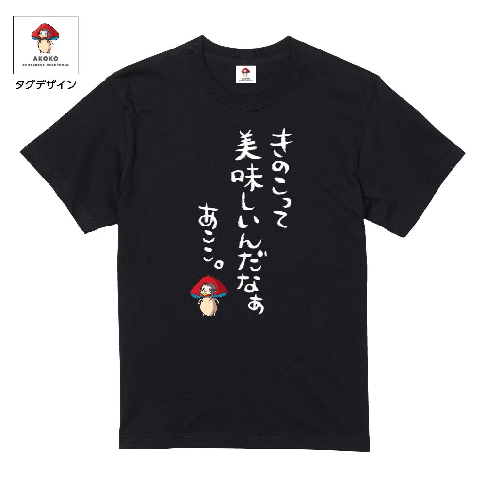 「きのこって美味しいんだなぁ」のあここTシャツ(黒)です。