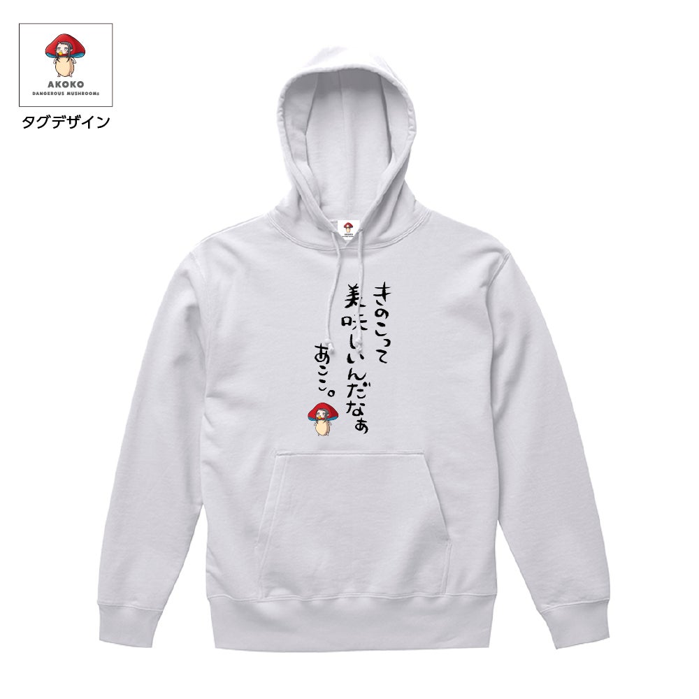 「きのこって美味しいんだなぁ」のあここパーカー(白)です。