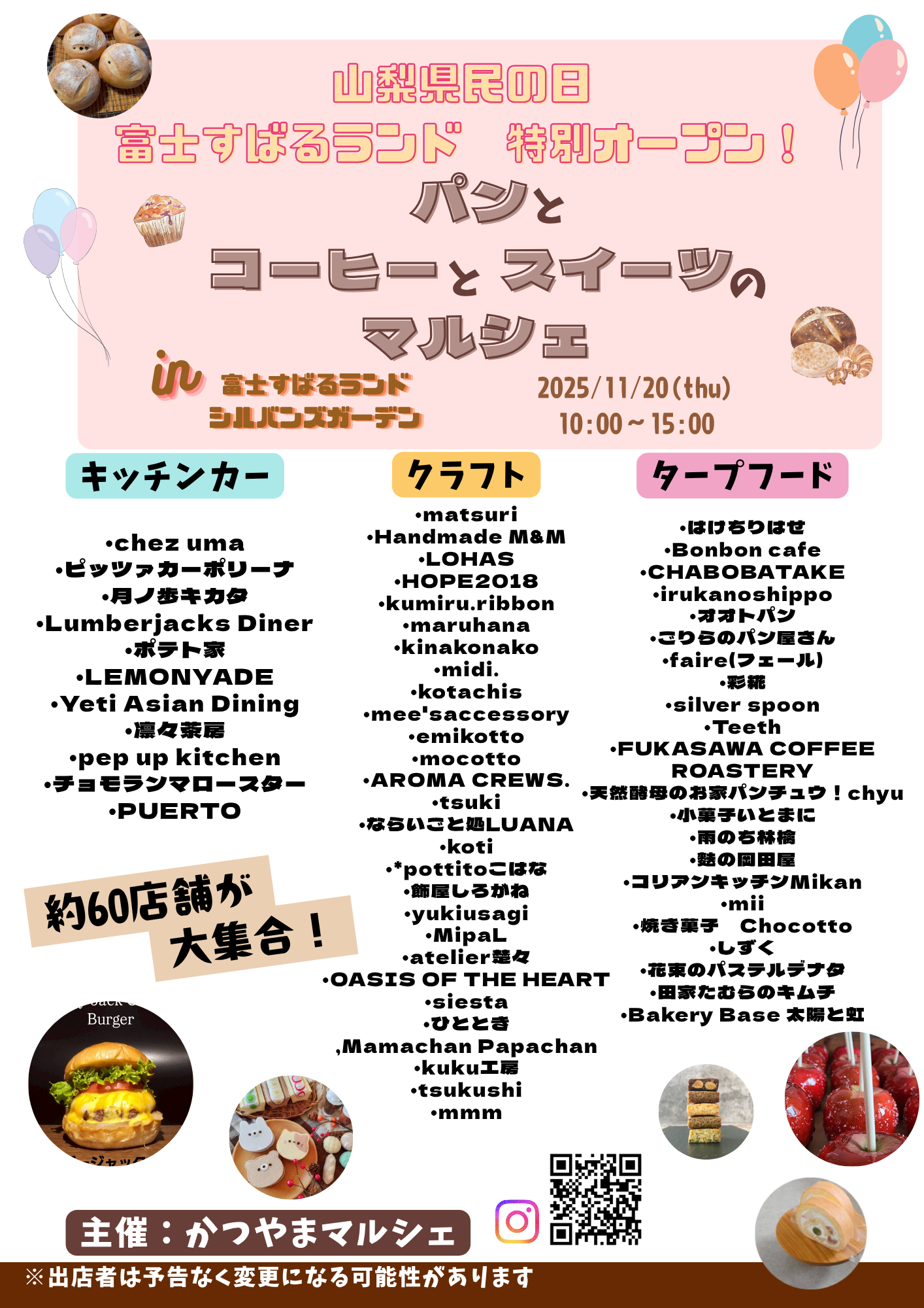 「富士すばるランド」では、11月20日(木)「山梨県民の日」を記念し入園料を無料とするほか、『パンとコーヒーとスイーツのマルシェ2025』『B2iサバイバルゲーム体験会』を同時開催いたします!!