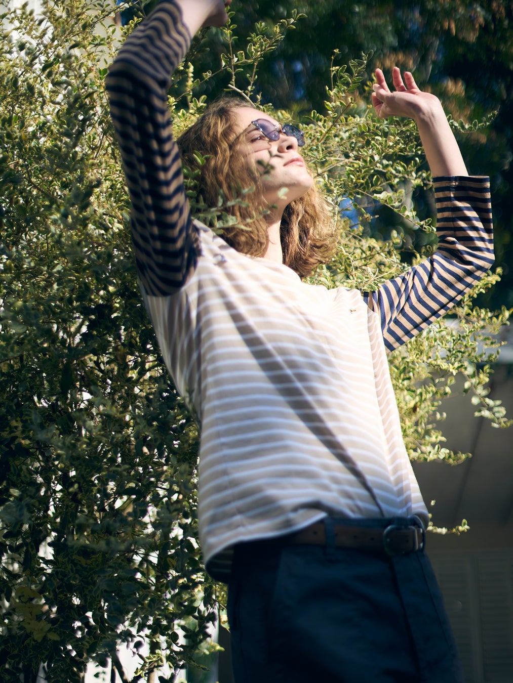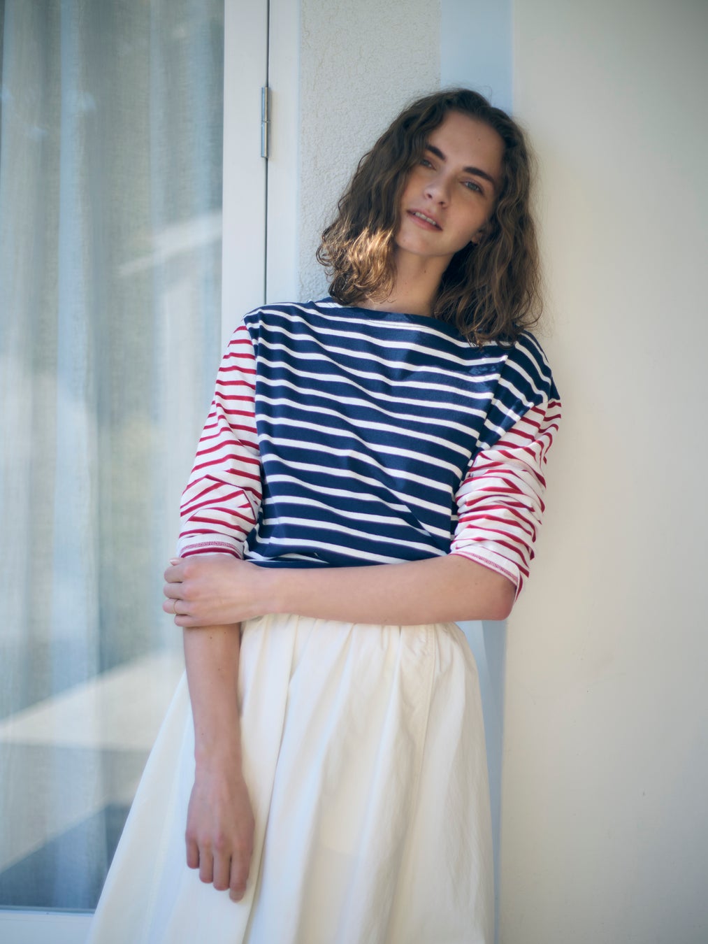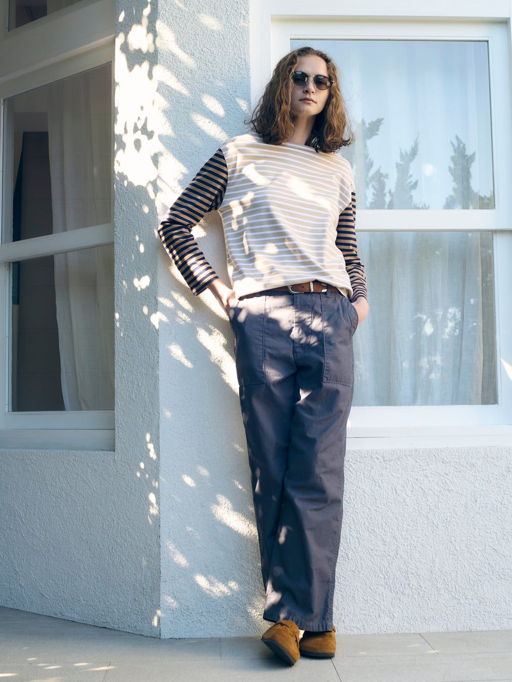 夏の定番ともいえるバスクTeeはカラーとピッチの異なるボーダーを組み合わせることにより遊び心のある表情を持たせました。伸縮性と軽やかさが特徴の綿天竺を使用し、着心地の良さにもこだわりました。
