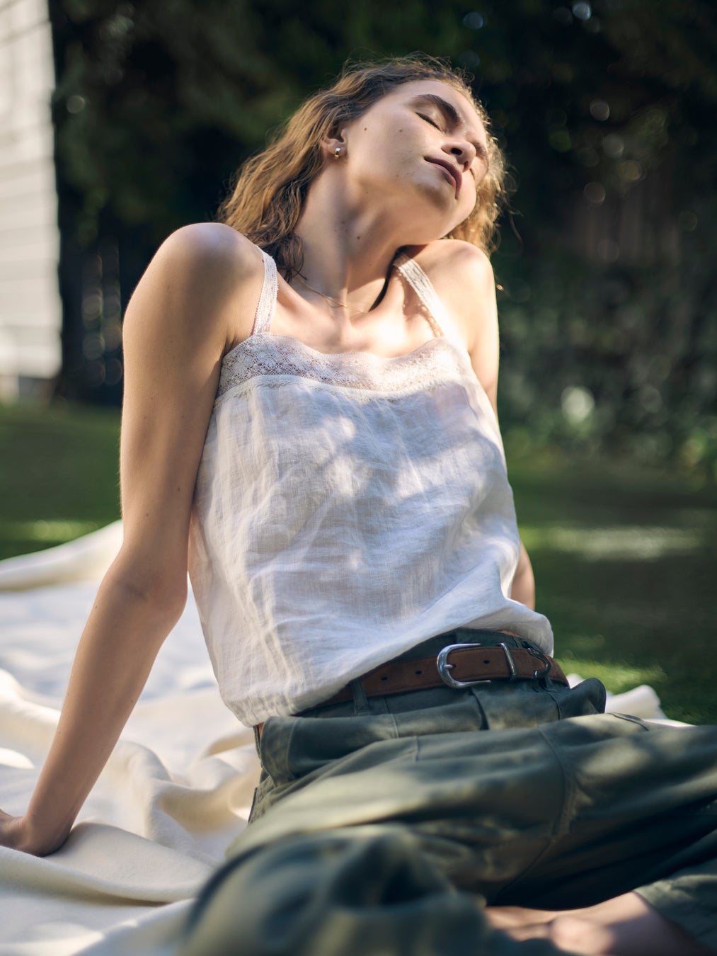 ハナが愛用していたヴィンテージのビスチェを再現したキャミソールは肩紐のレースと細かいギャザーを取りながら施したハンドステッチがポイント。カットソーに重ねるだけで存在感のあるスタイルが完成します。