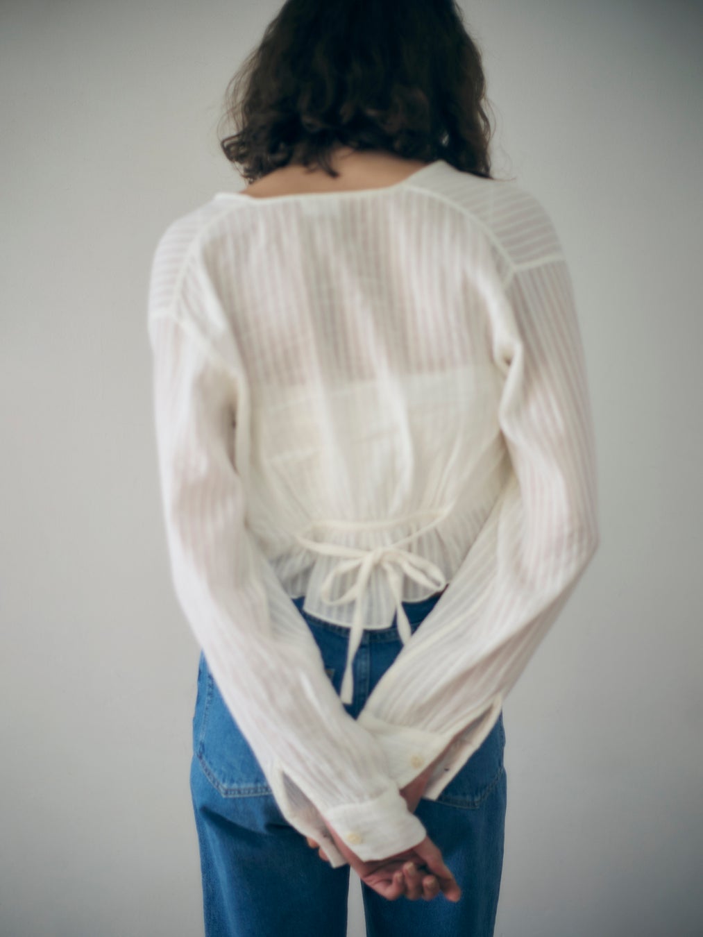 キャミソールと同様にインド製ならではの素材の柔らかさがシルエットにマッチしたシャツは、さらっと羽織としても纏える1枚です。背面に施されたスピンドルがシルエットの変化だけでなく、デザインのアクセントに。