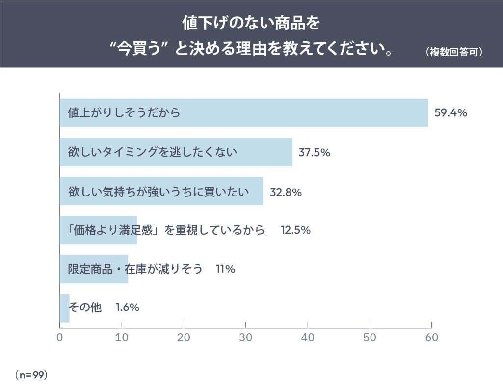 「値下げされない商品を今買う理由」を尋ねたところ、最も多かったのは「値上がりしそうだから」(59.4%)でした。