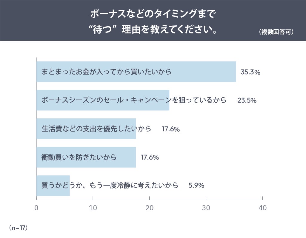 「まとまったお金が入ってから買いたい」(35.3%)、「セール・キャンペーンを狙っている」(23.5%)、「衝動買いを防ぎたい」(17.6%)などが挙げられました。