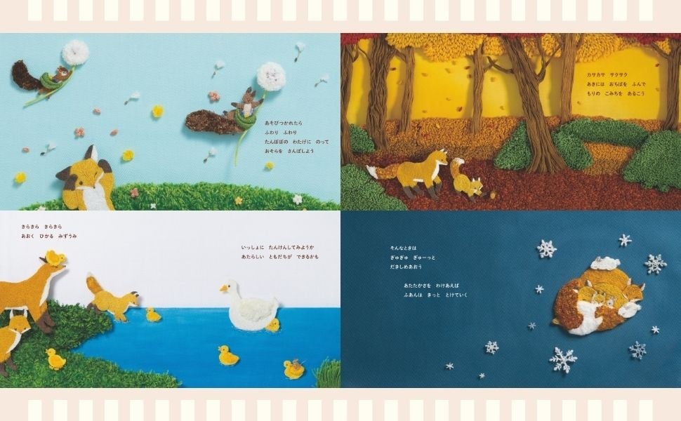 春は花畑、夏は湖、秋は森、冬は雪景色――四季折々の美しい風景を刺繍で描いています。きつねの親子のほかにも、りすやくま、うさぎなど、森で暮らすかわいらしい動物たちがたくさん登場します。